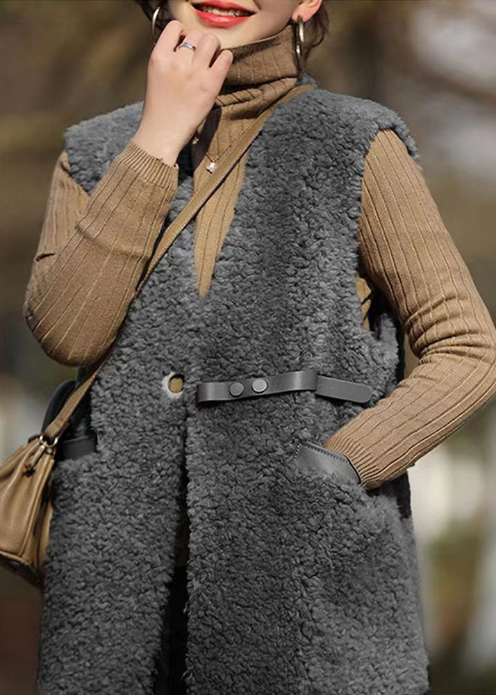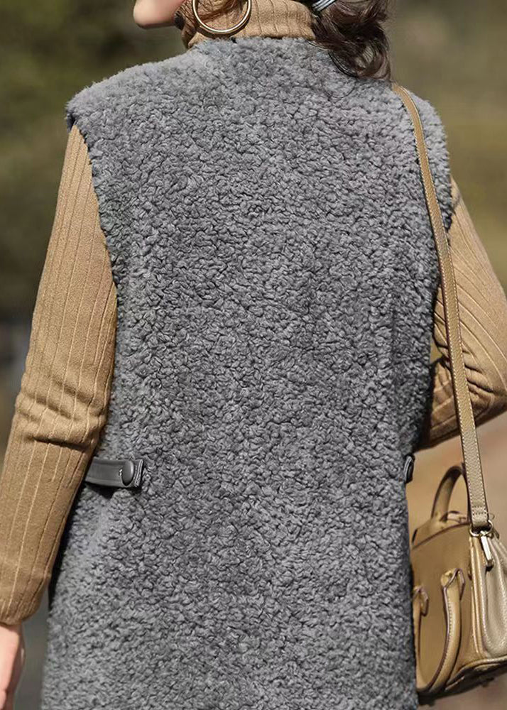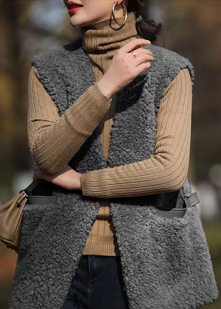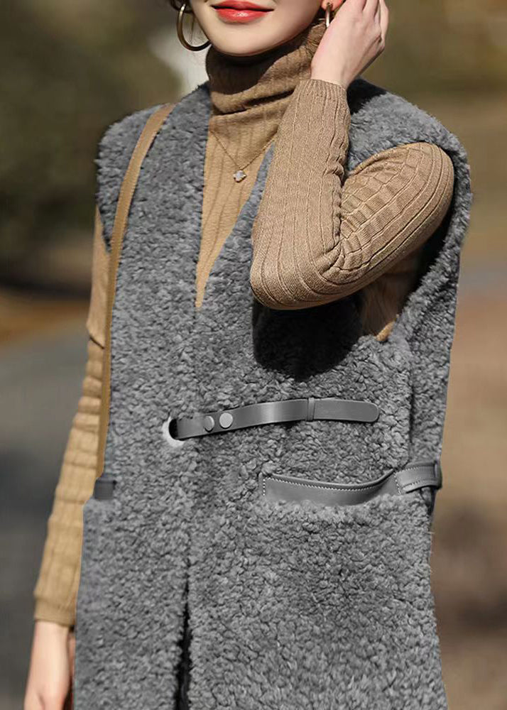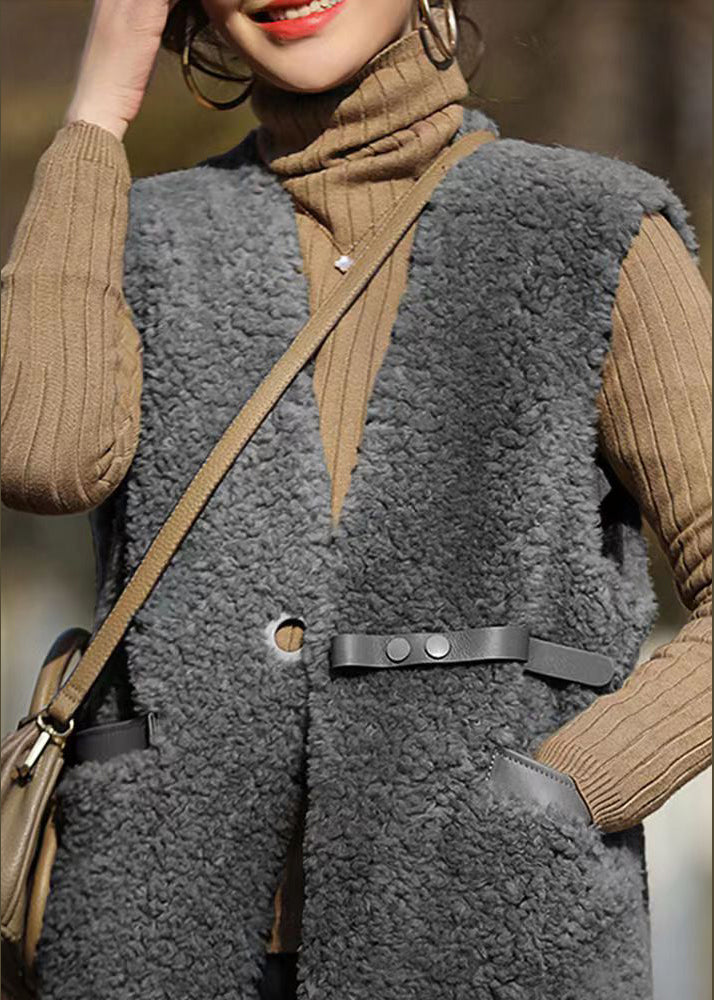 French Grey V Neck Pockets Patchwork Wool Vest Sleeveless