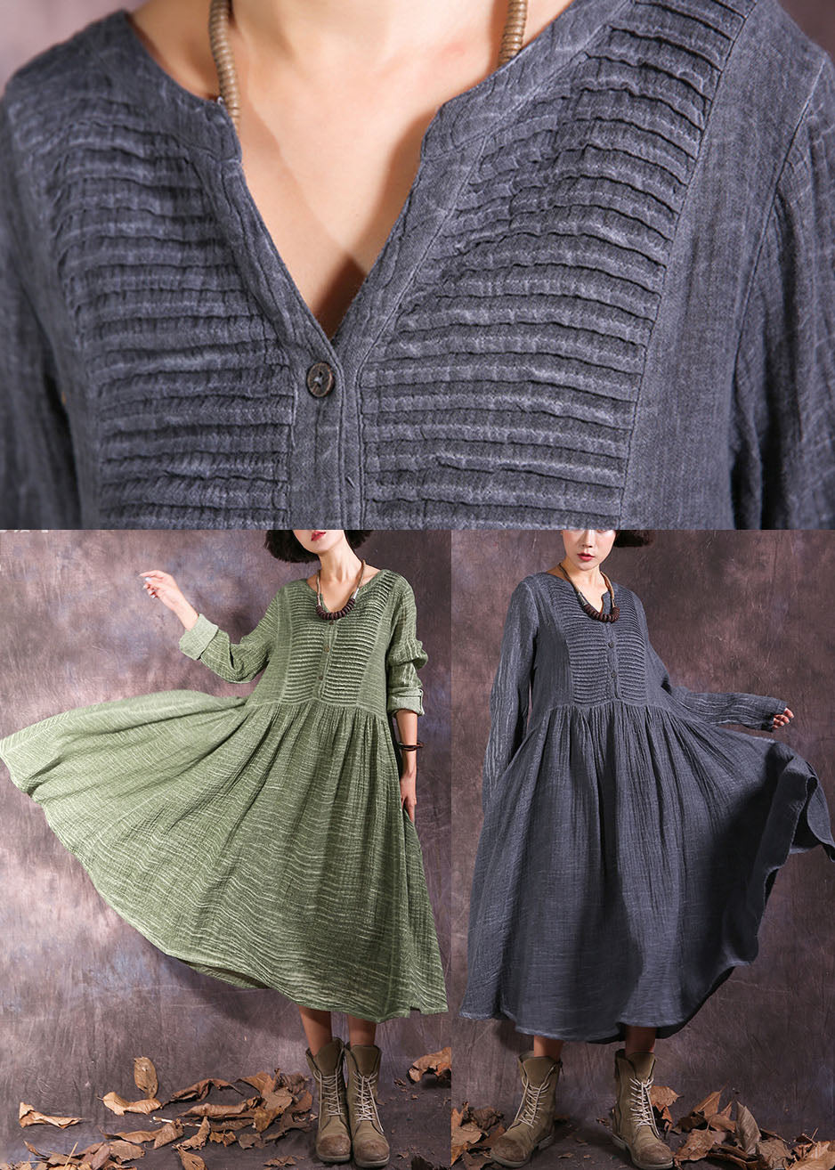 French Grey V Neck wrinkled Cotton Holiday Dress Spring