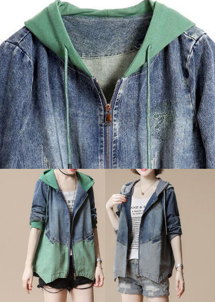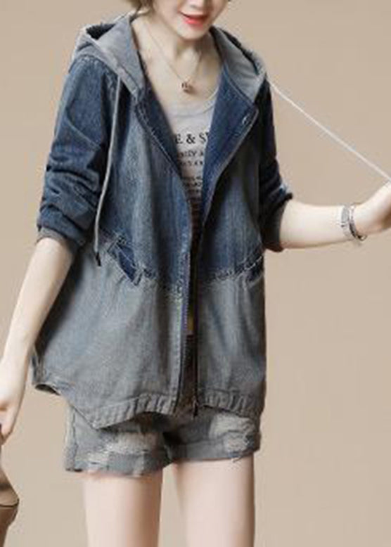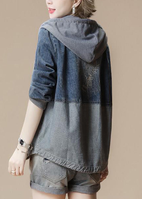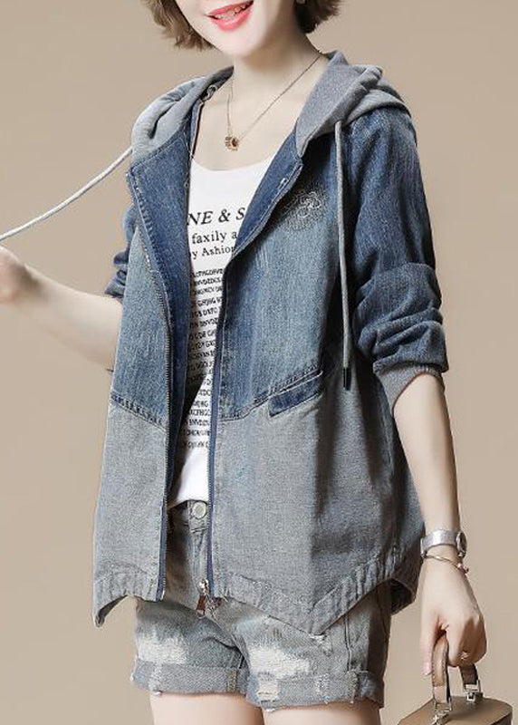 French Grey Zippered Patchwork Hoodie Denim Coats Fall