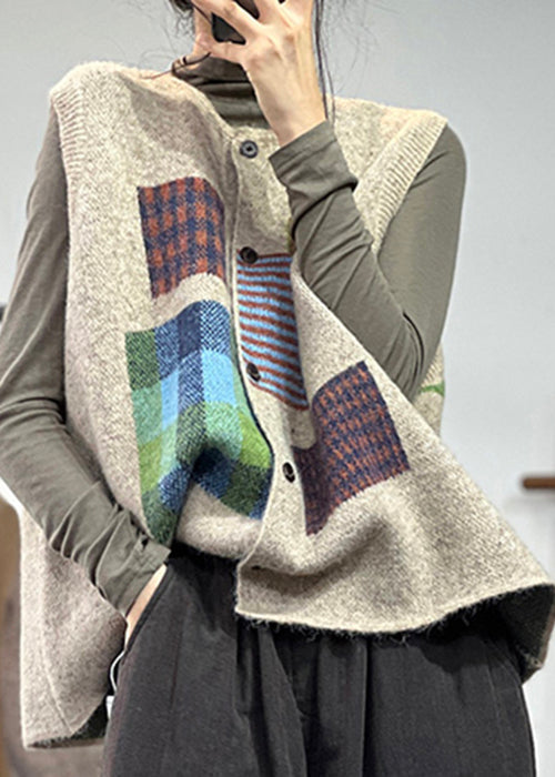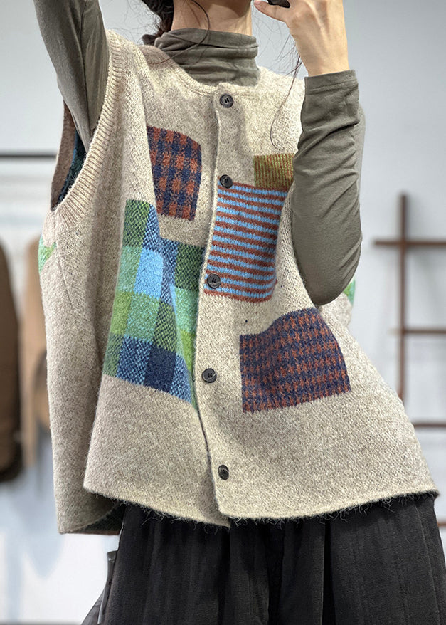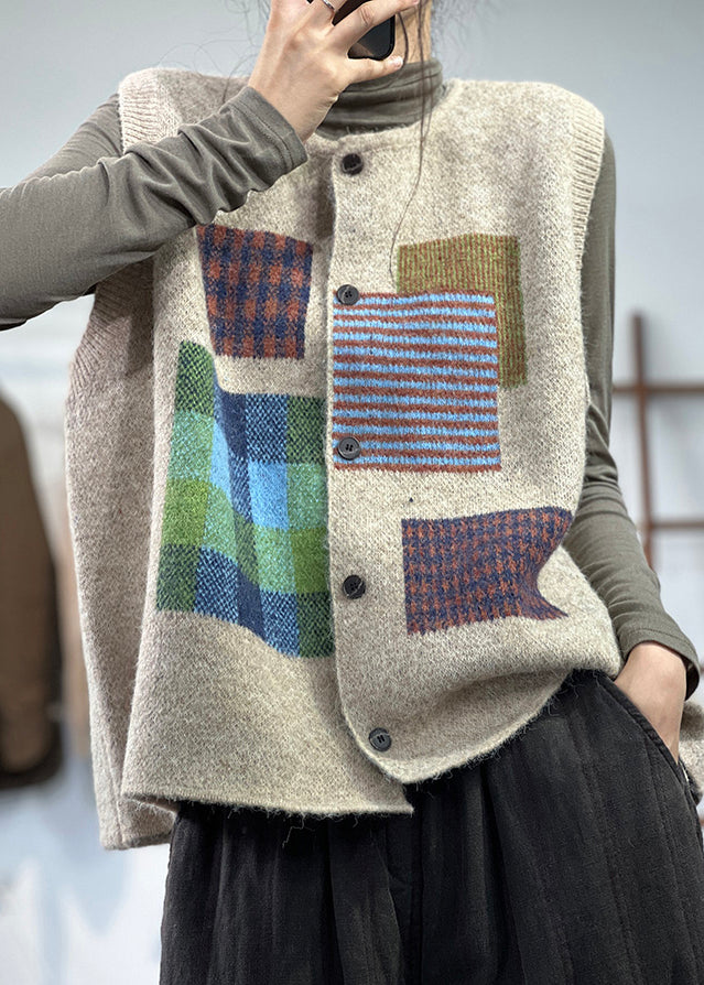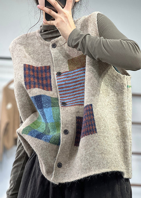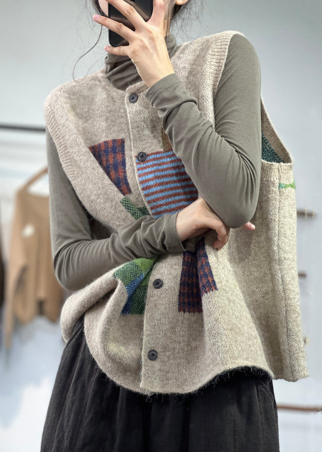 French Khaki Button Print Woolen Waistcoat Sleeveless