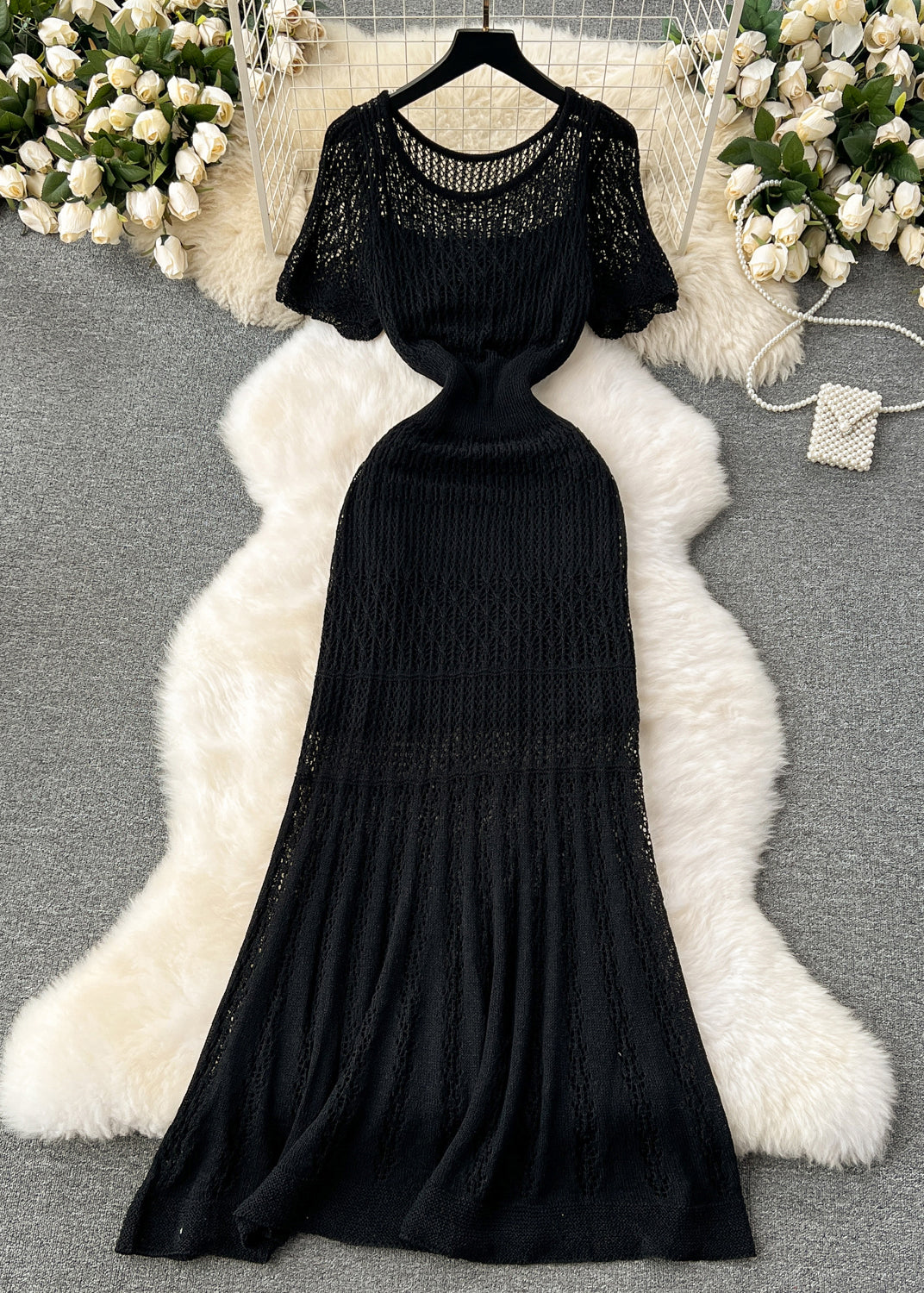 French Khaki O Neck Hollow Out Knit Two Pieces Set Summer