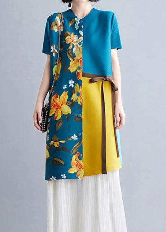 French Khaki O-Neck Print Patchwork Wrinkled Tie Waist Mid Dresses Summer