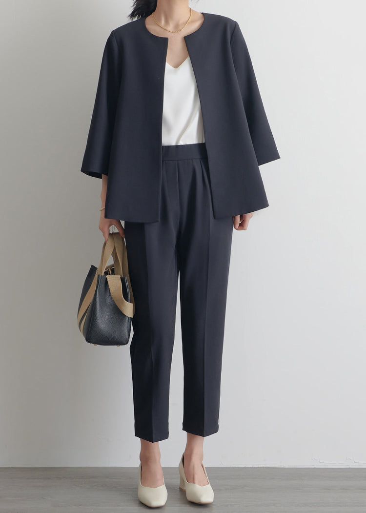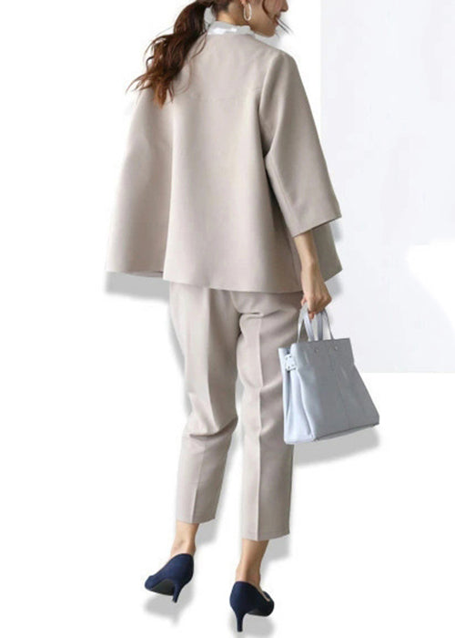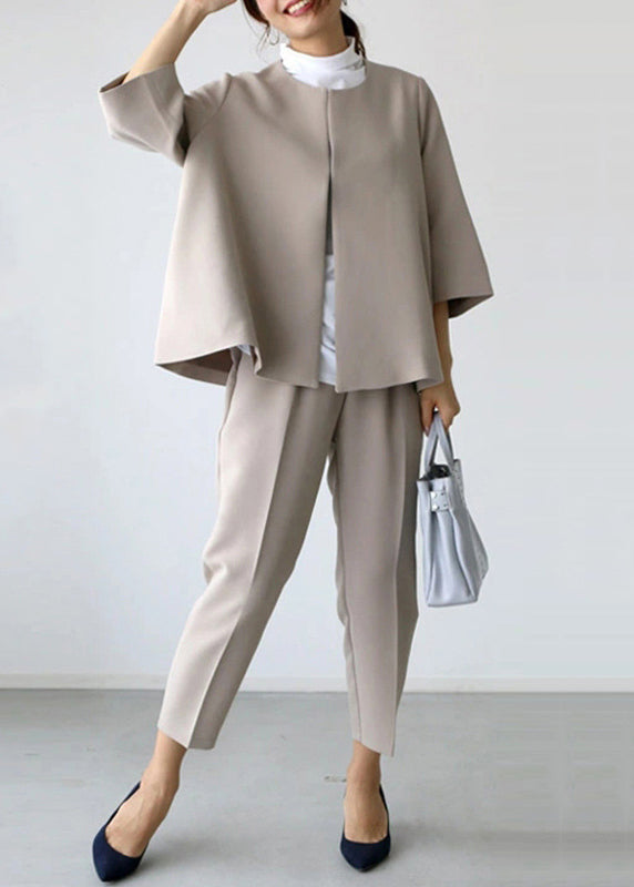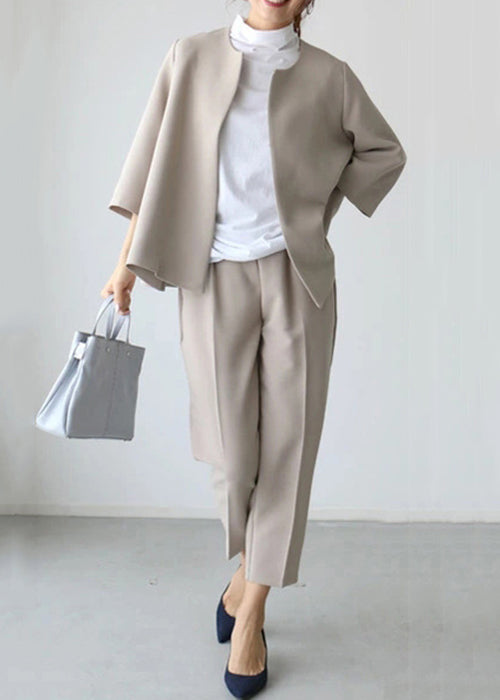 French Khaki O Neck Tops And Crop Pants Spandex Two Piece Set Bracelet Sleeve