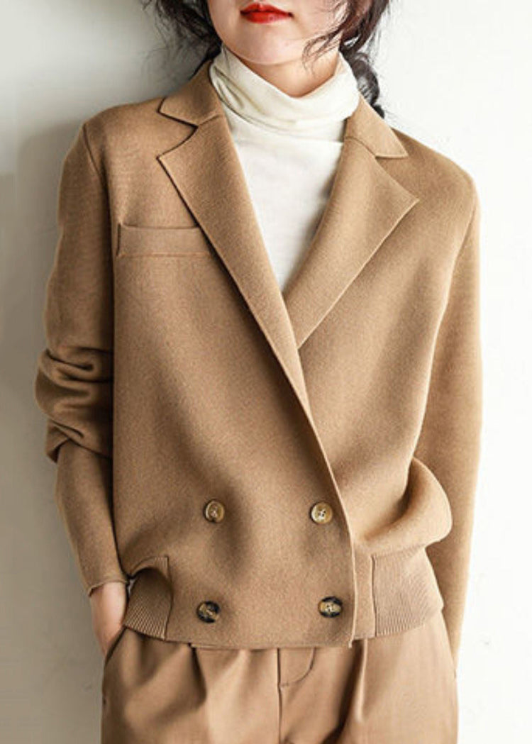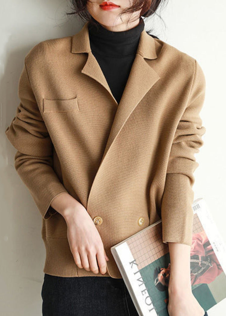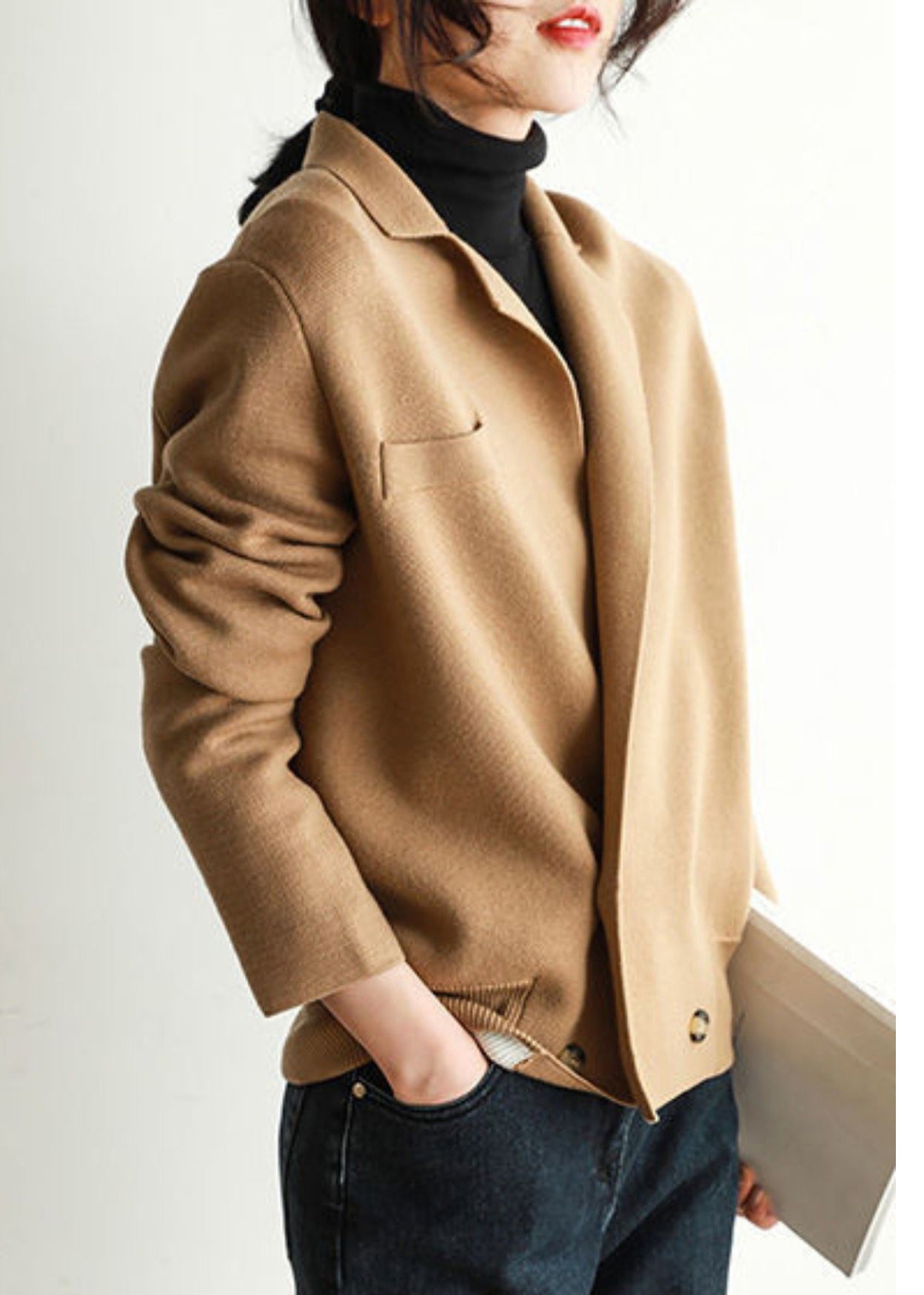 French Khaki Peter Pan Collar Button Patchwork Knit Coats Fall