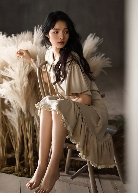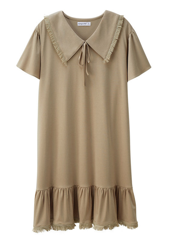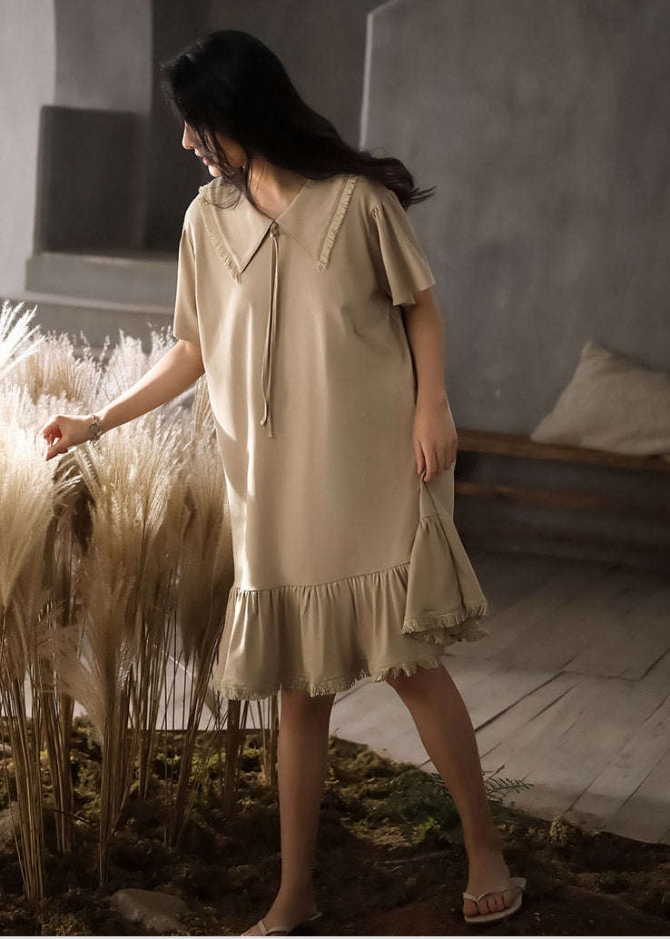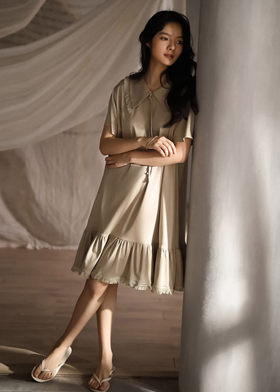 French Khaki Peter Pan Collar Patchwork Solid Cotton Long Dress Short Sleeve