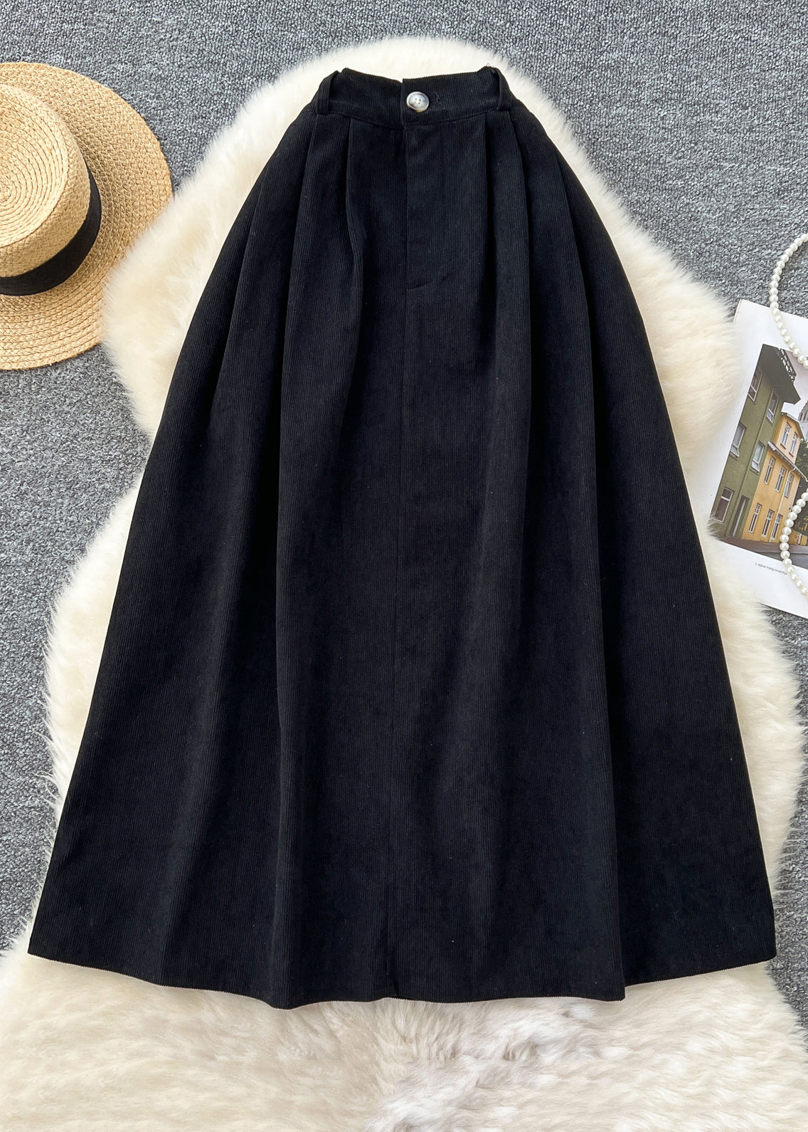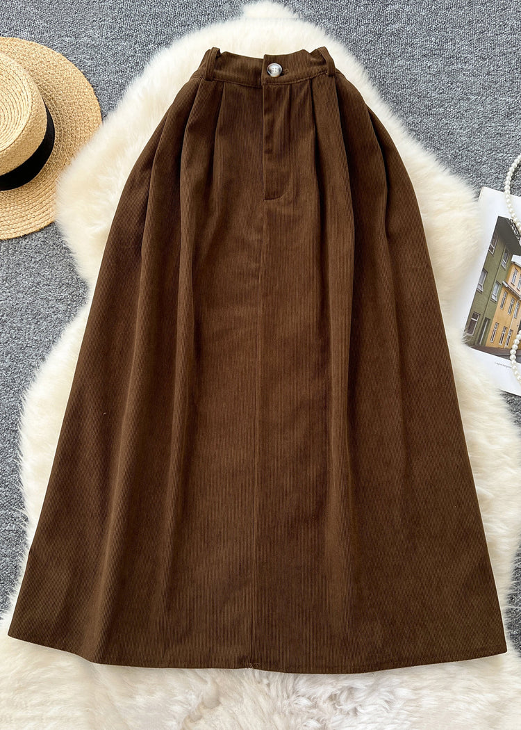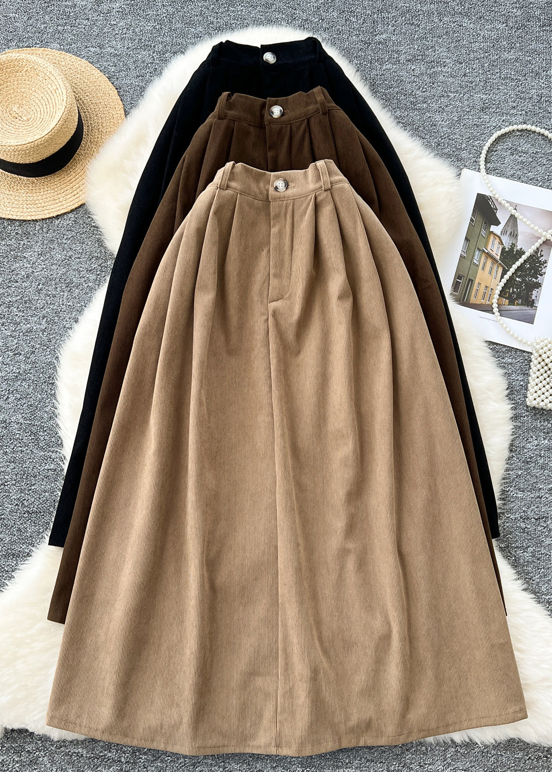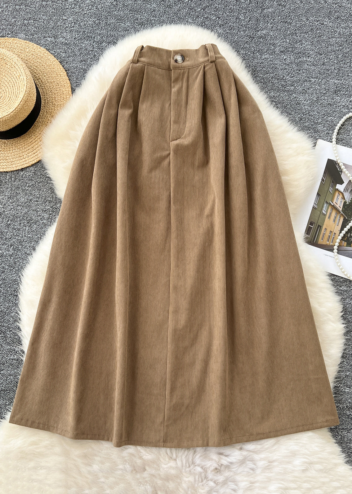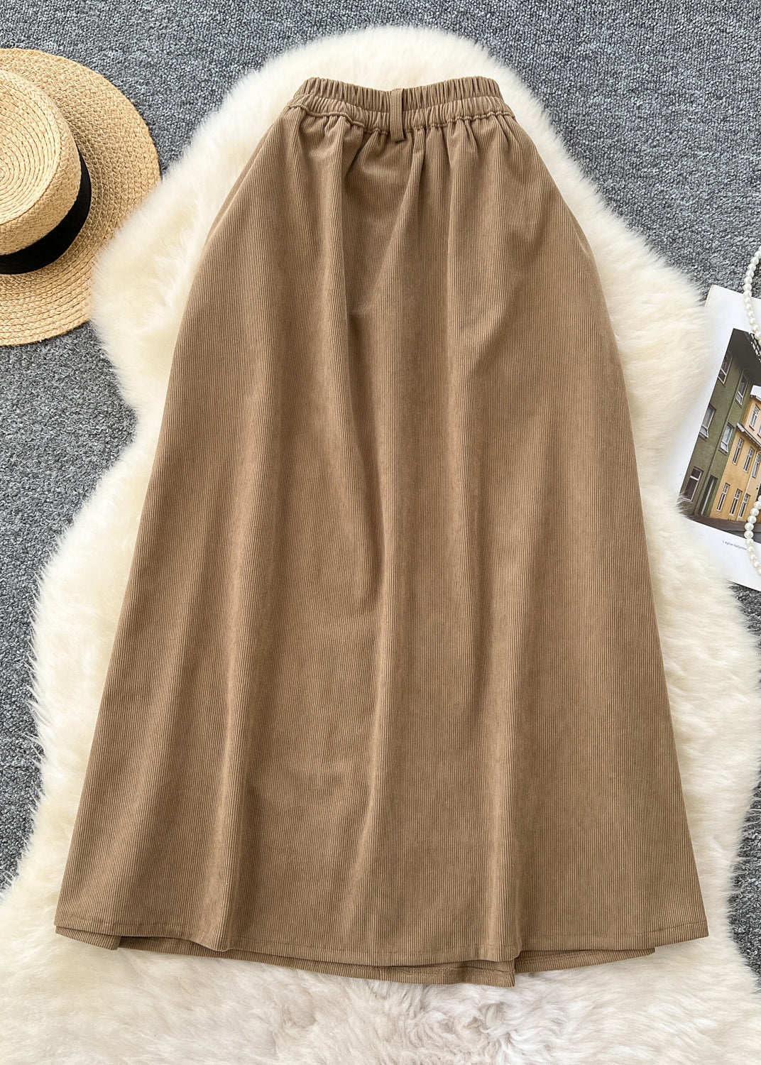 French Khaki Pockets Elastic Waist Corduroy Skirts Winter