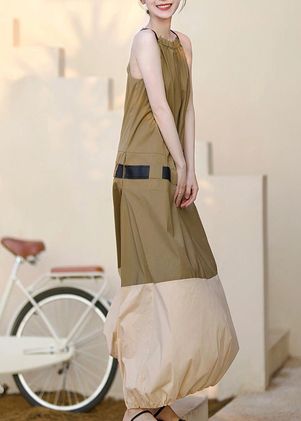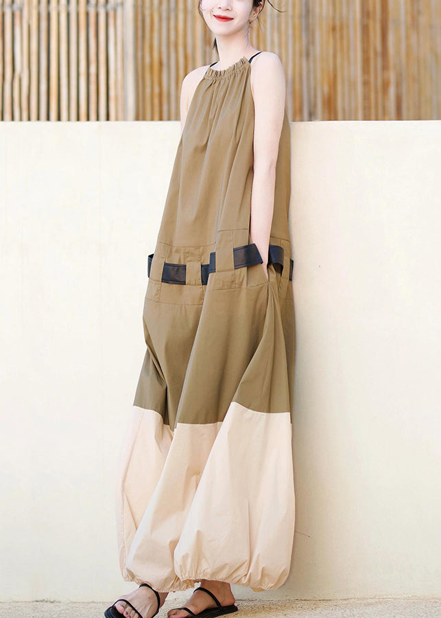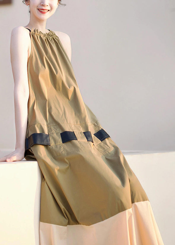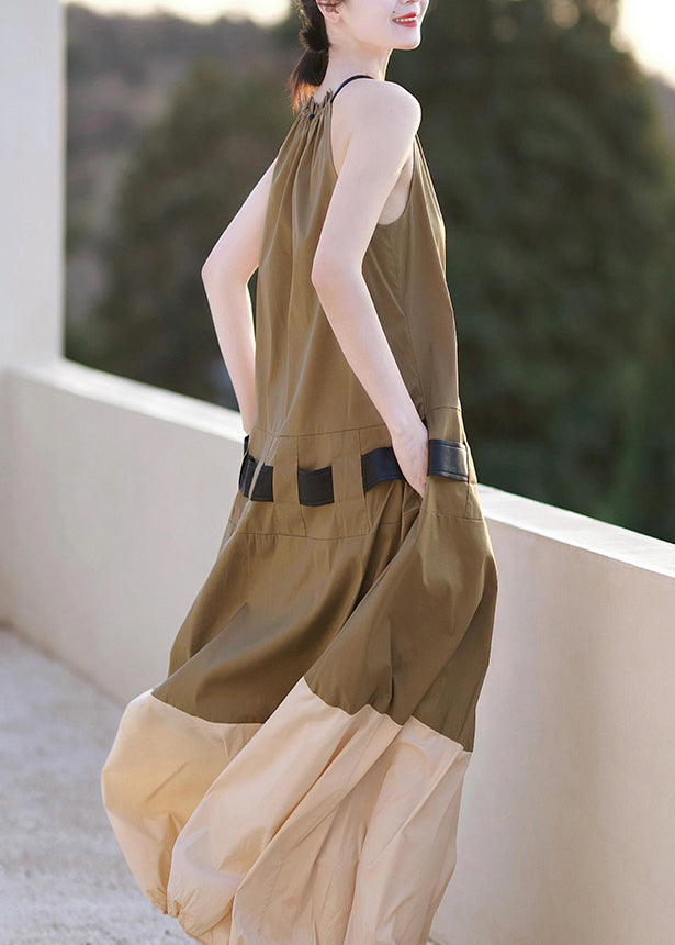 French Khaki Pockets Patchwork Cotton Dress Sleeveless