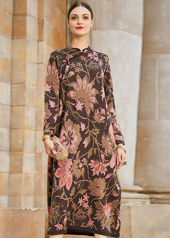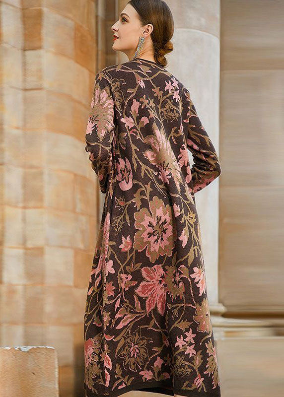 French Khaki Print Original Design Oriental Knit Coat Winter
