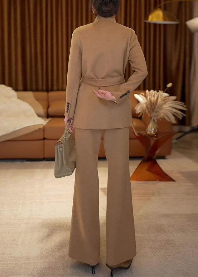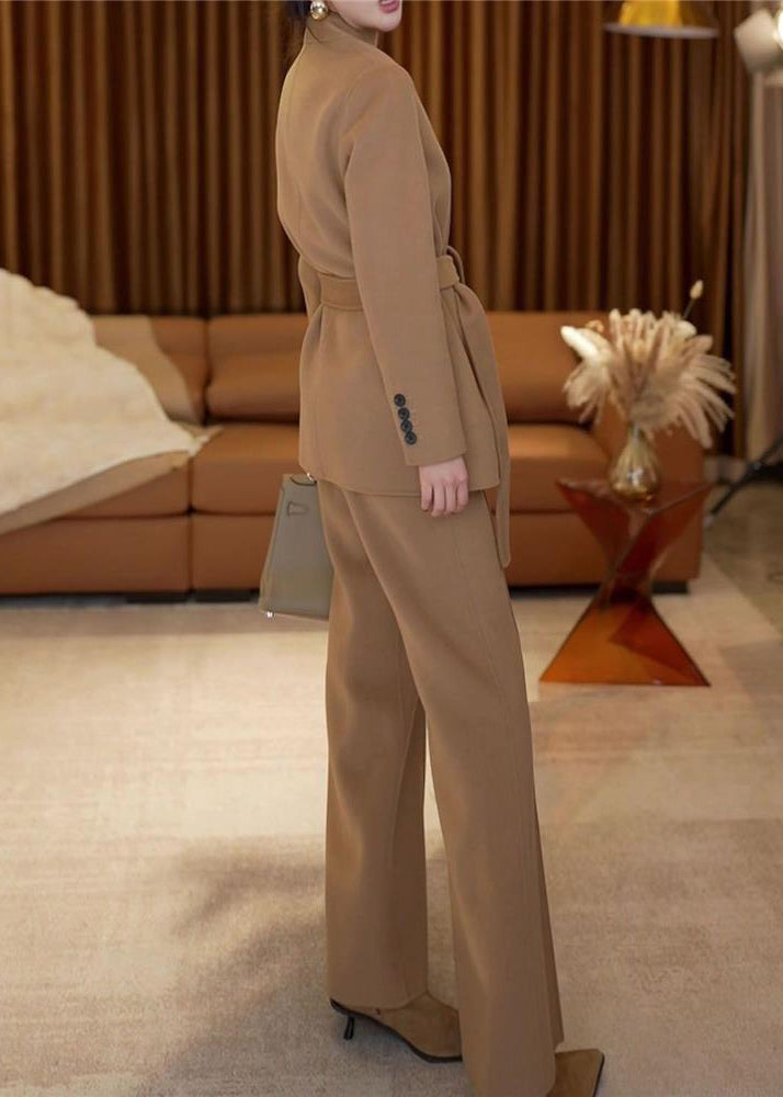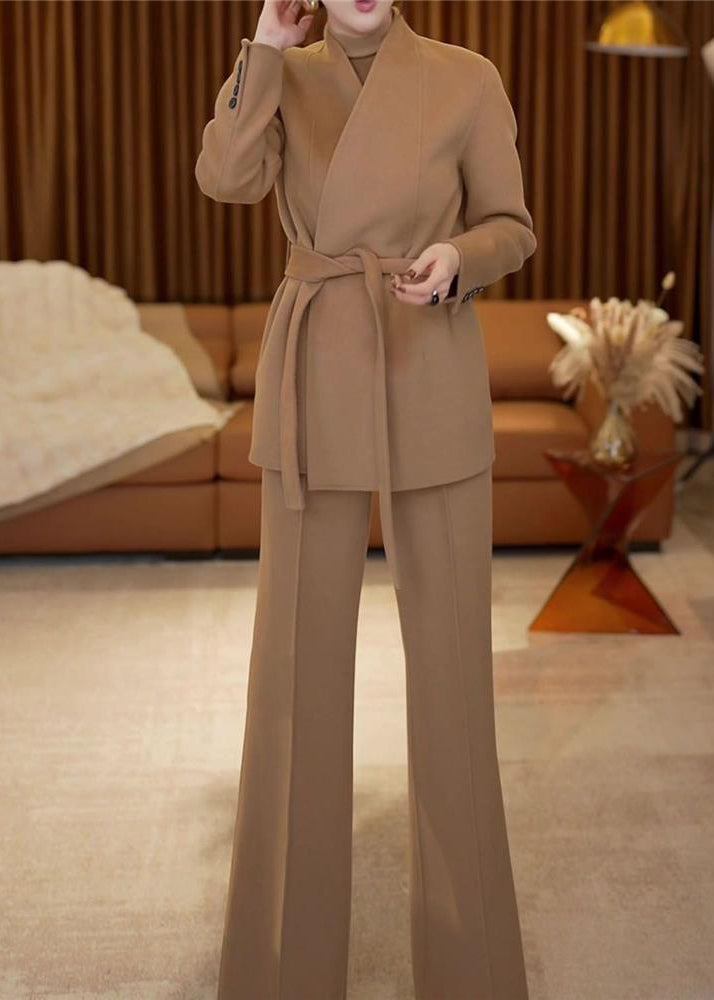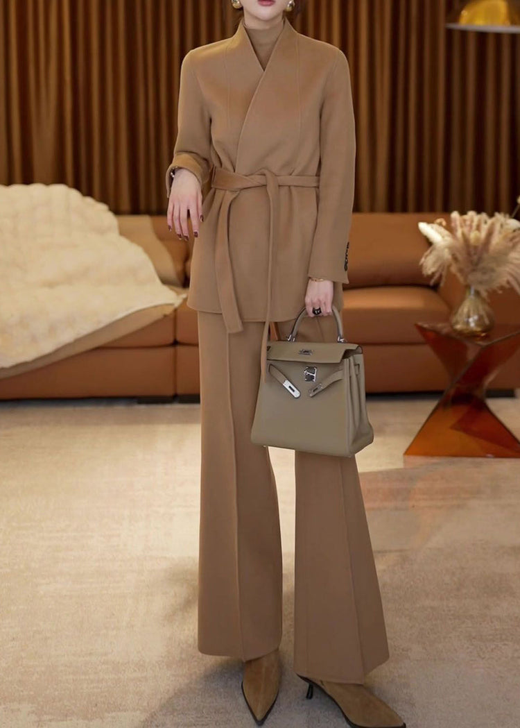 French Khaki V Neck Tie Waist Woolen Two-Piece Set Winter