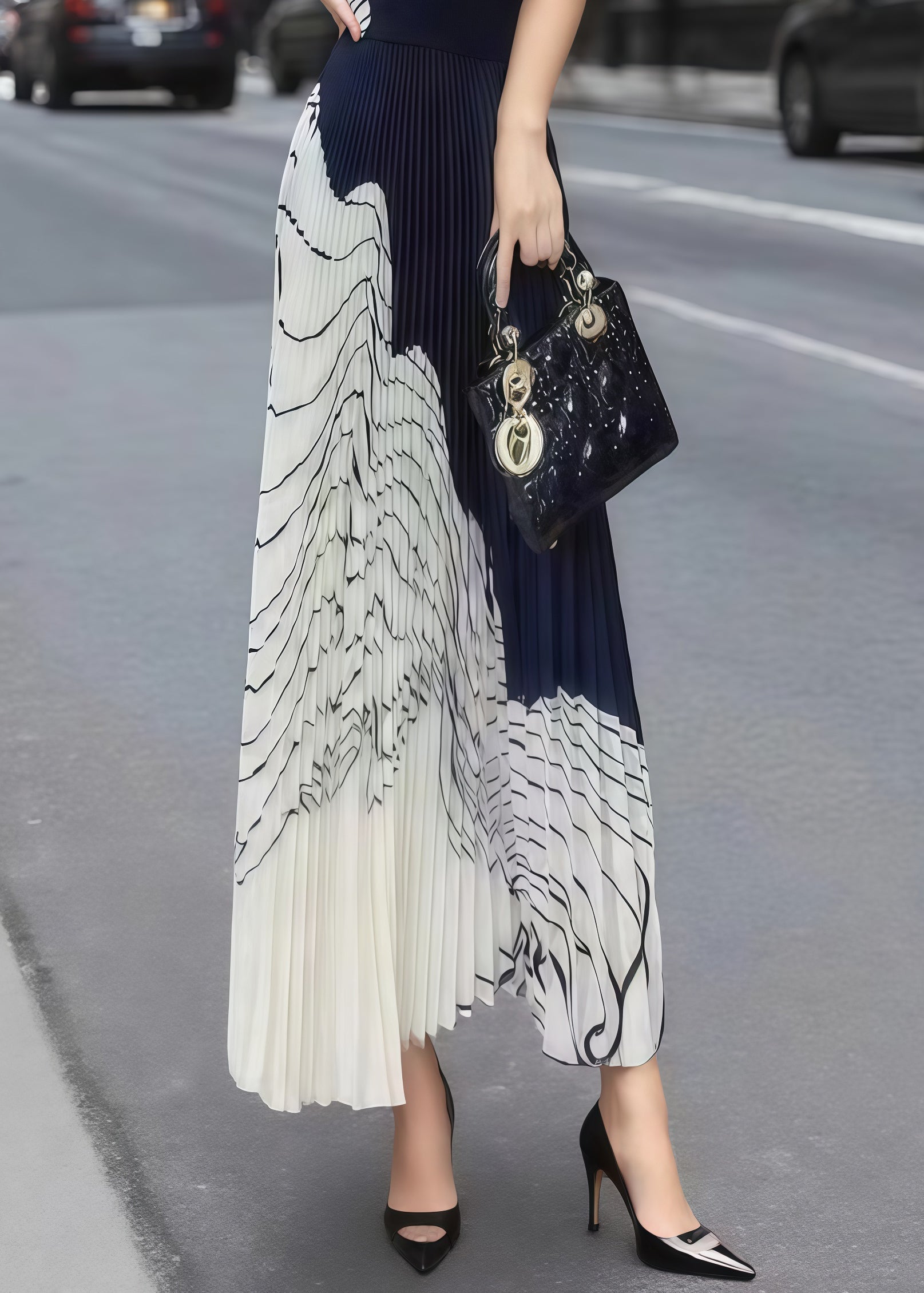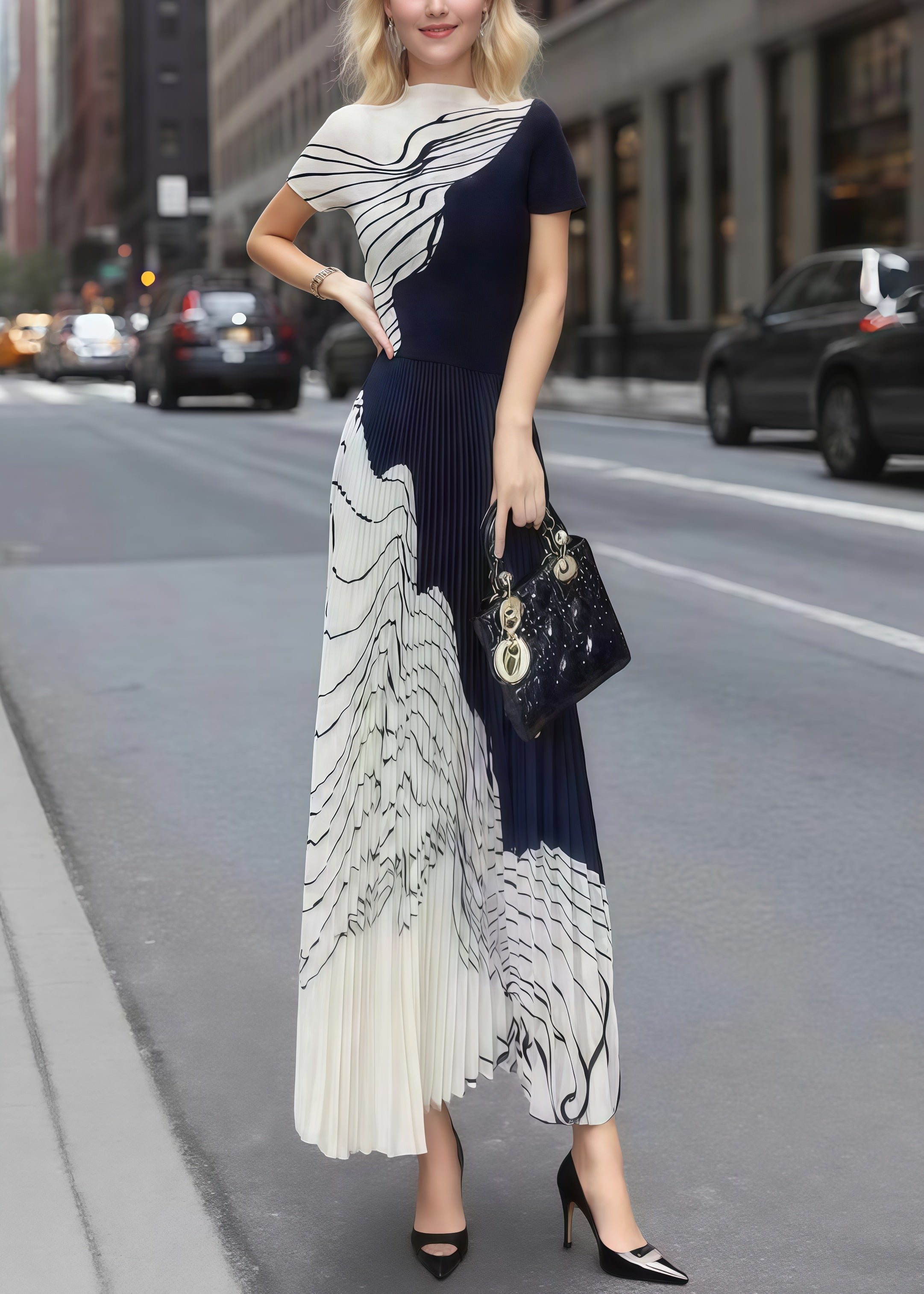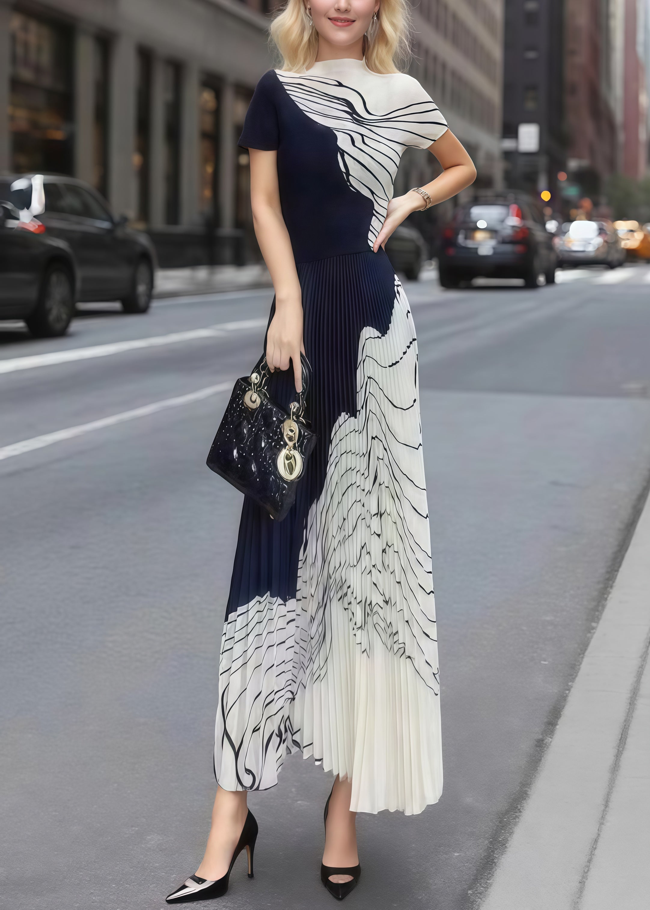 French Mixed Color Stand Collar Print Pleated Dress Summer