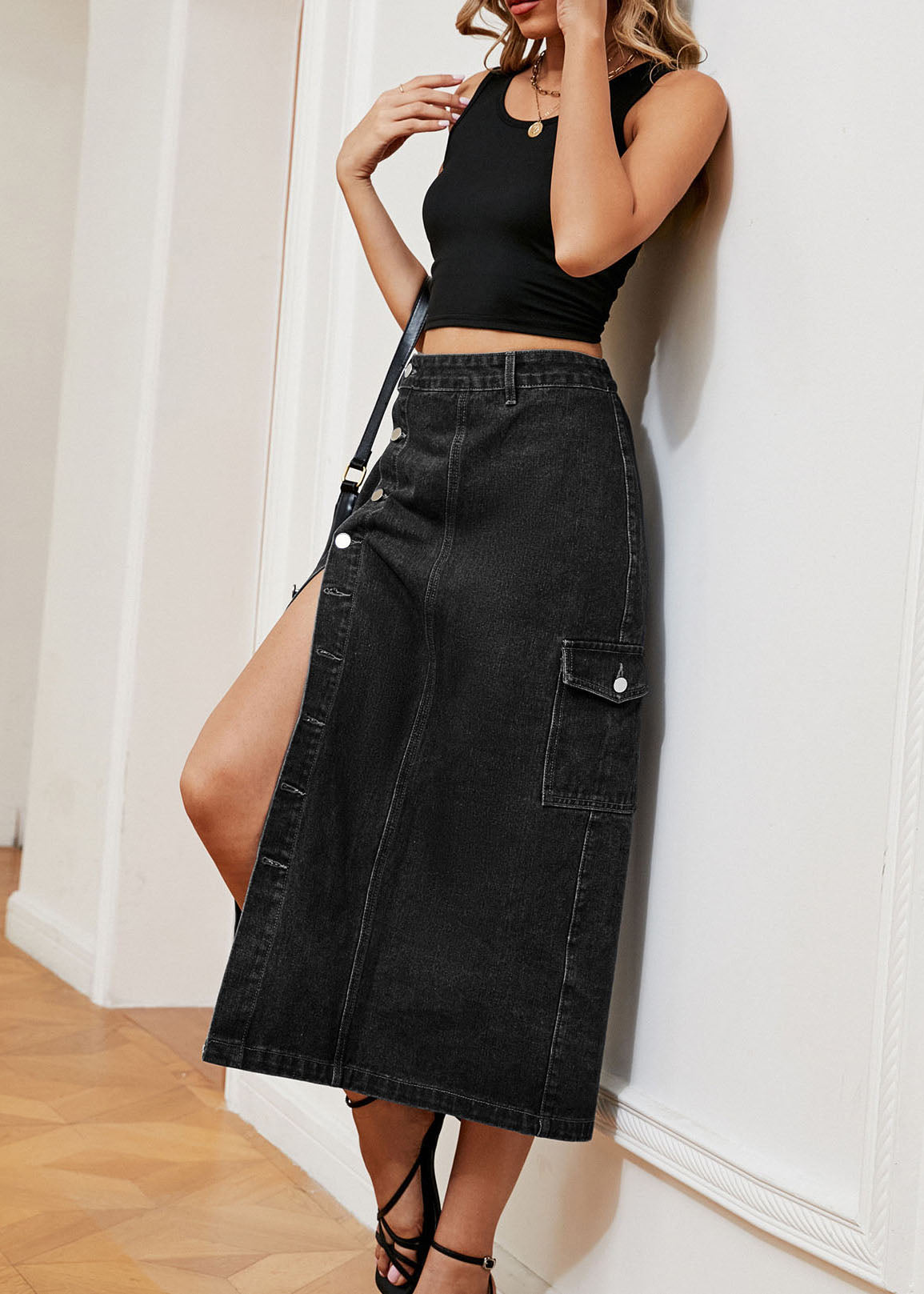 French Navy Button Elastic Waist Denim Skirts Summer