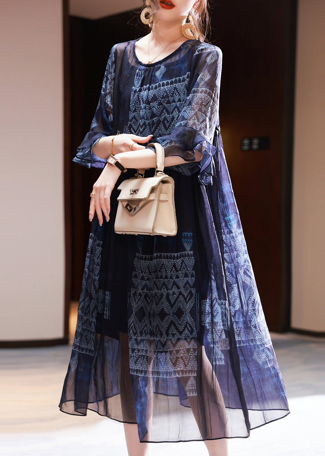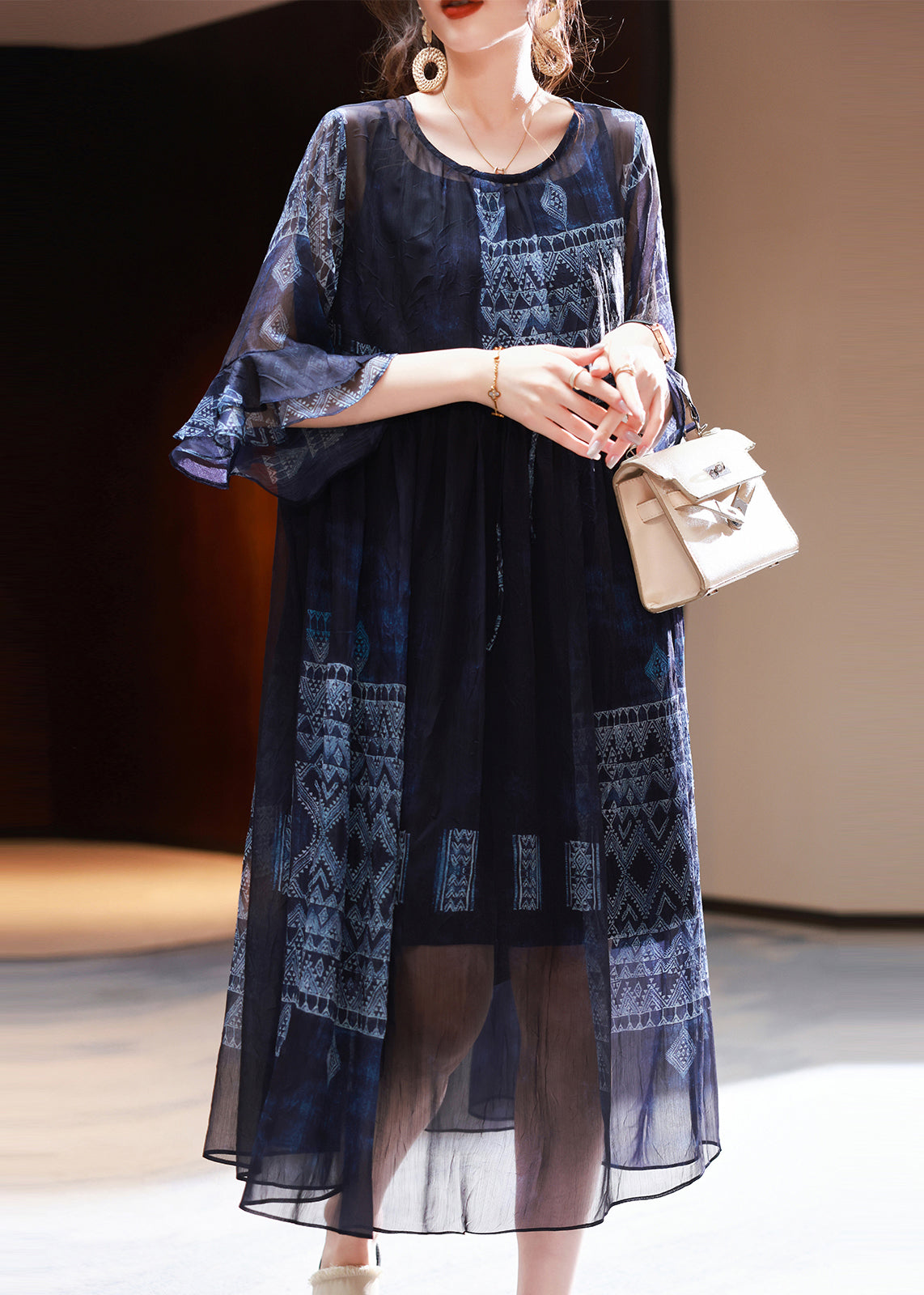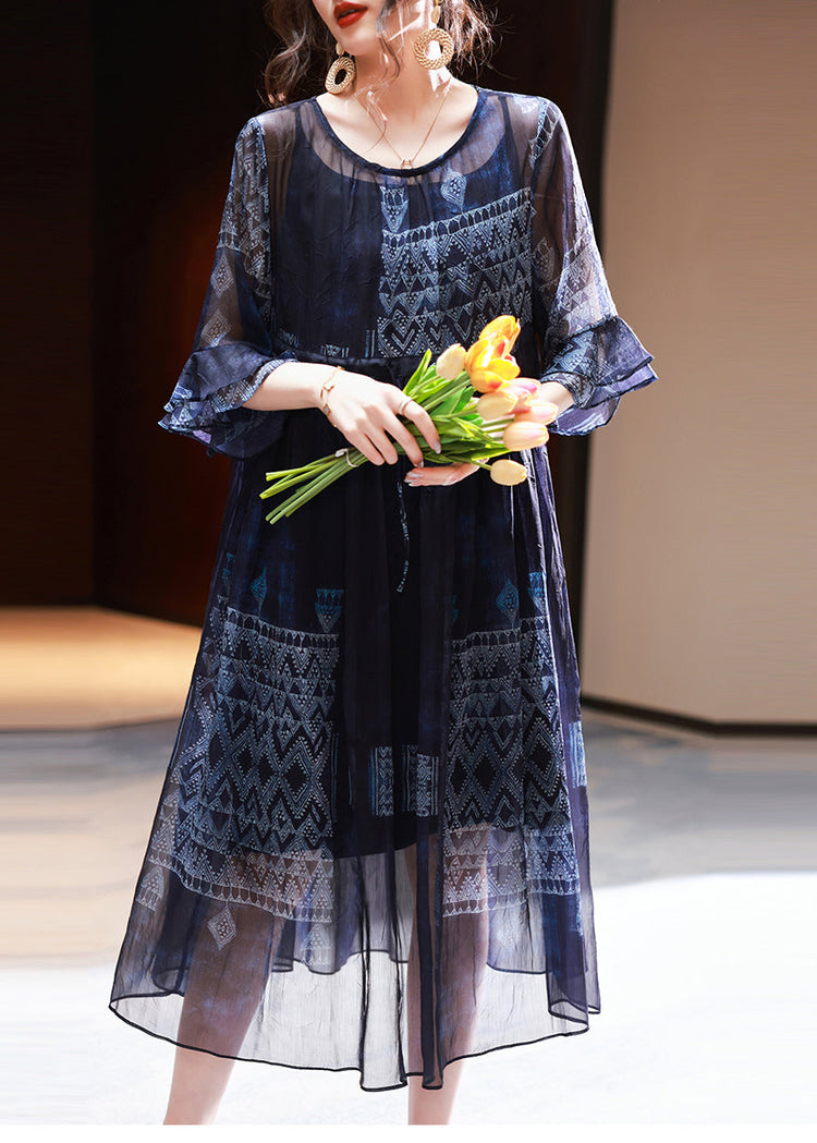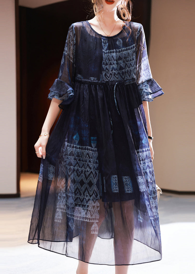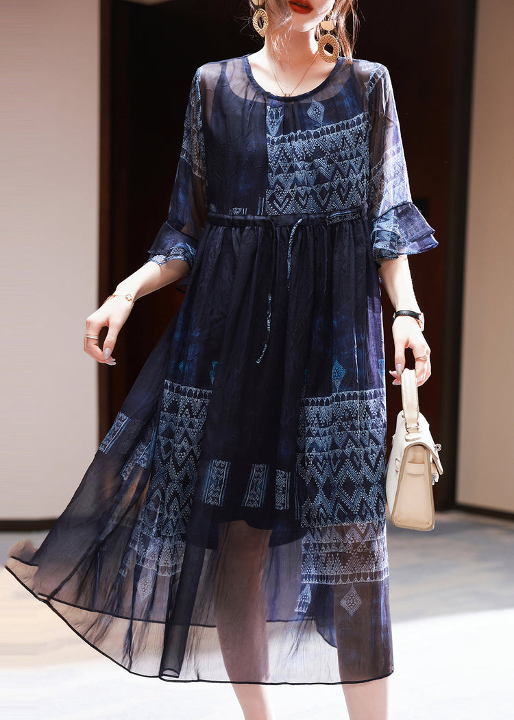 French Navy Cinched Print Chiffon Dress Summer