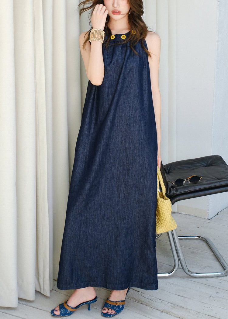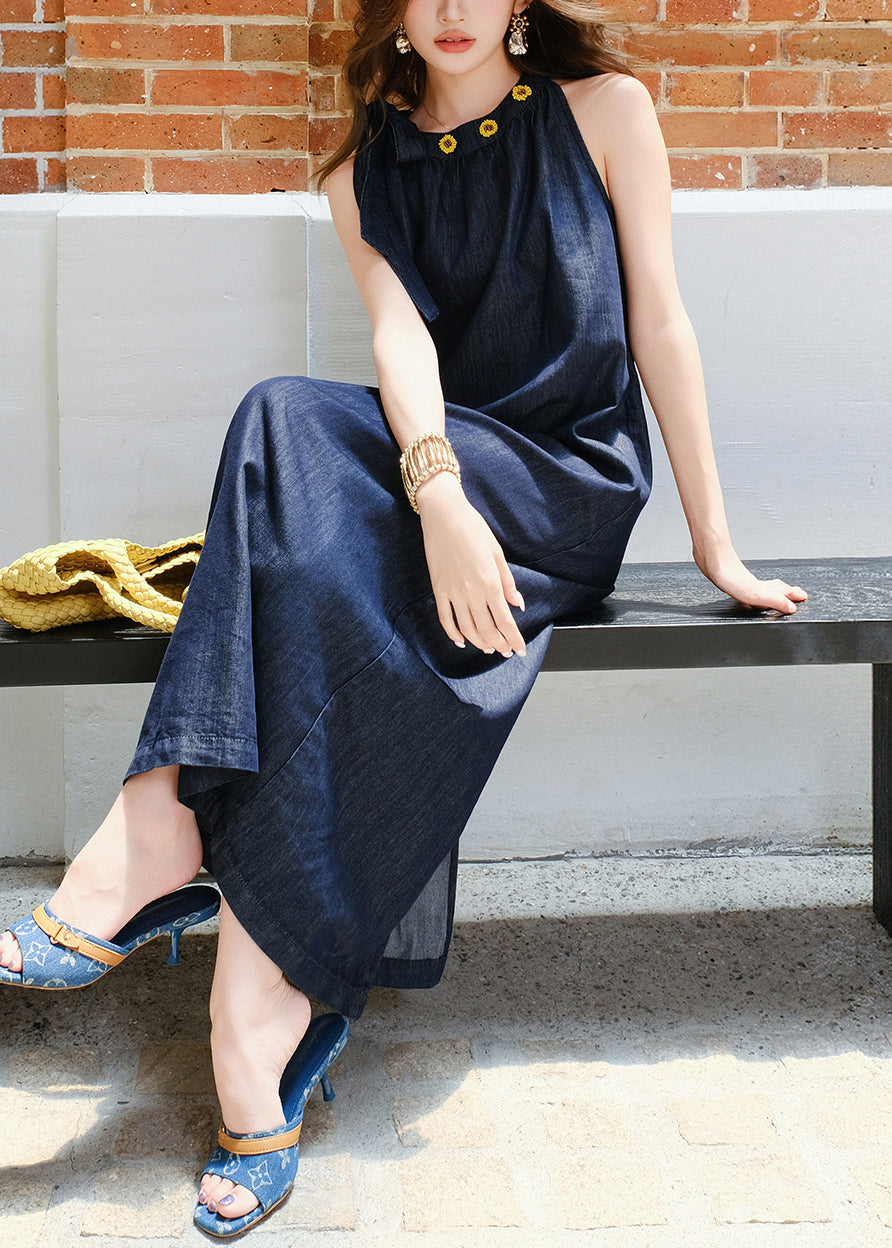 French Navy Lace Up Pockets Denim Long Dress Sleeveless
