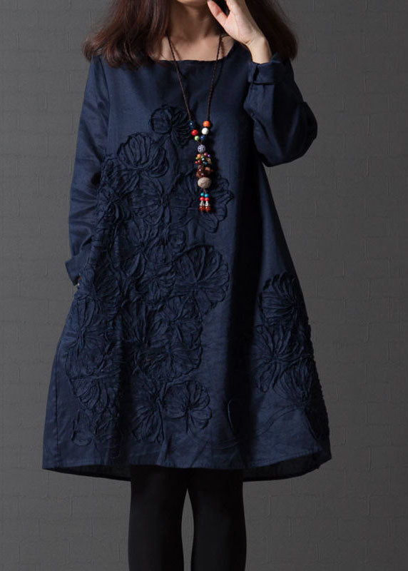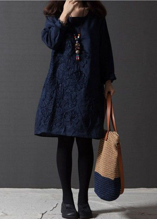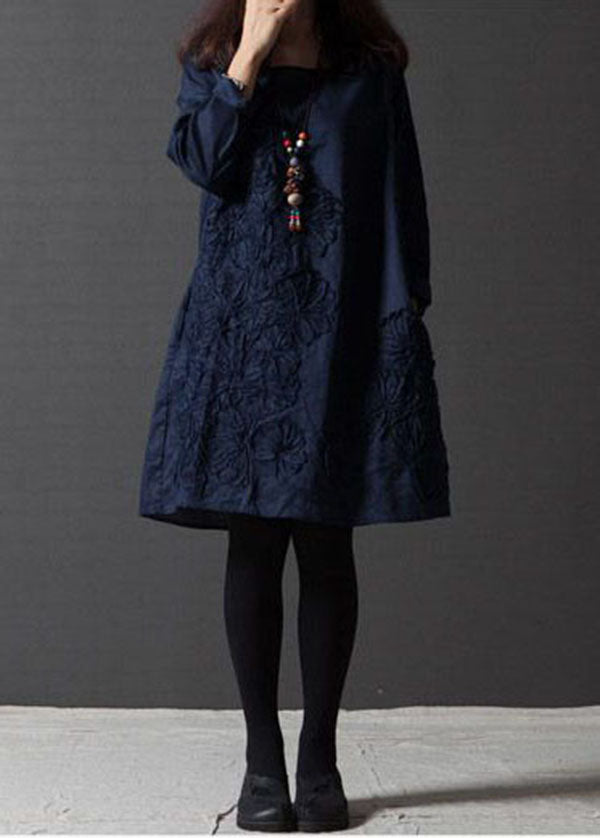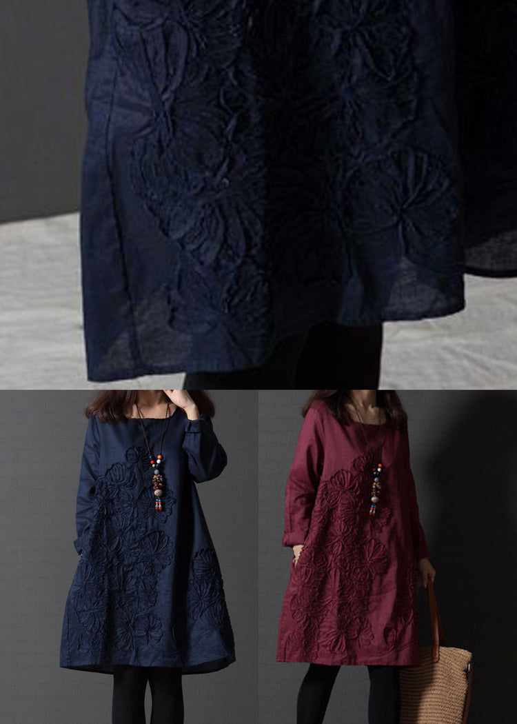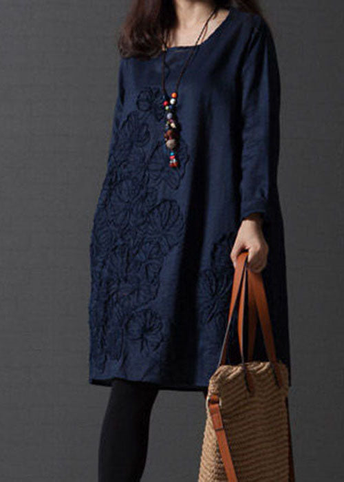 French Navy O-Neck Embroideried Linen Vacation Dresses Spring