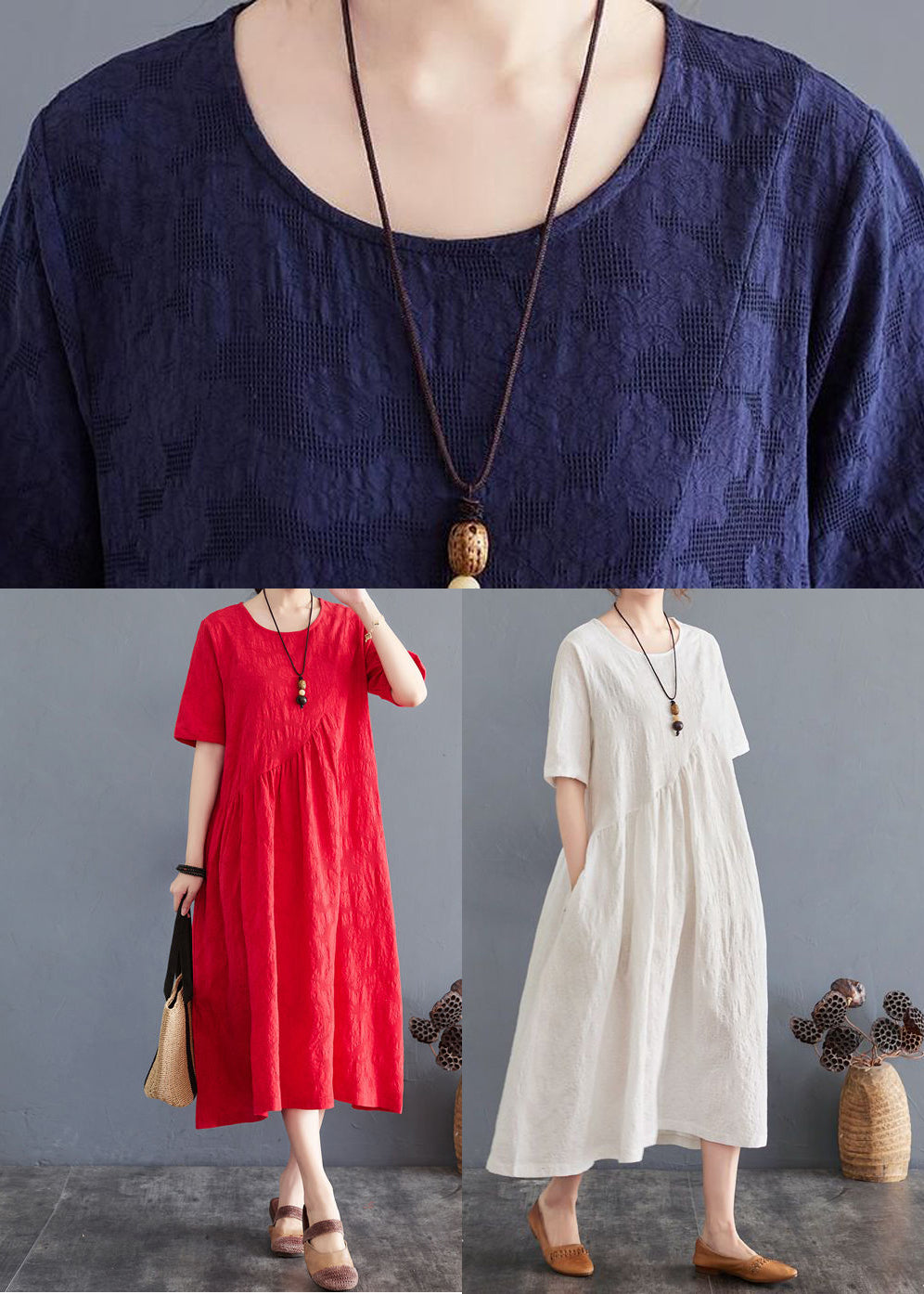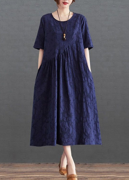 French Navy O-Neck Patchwork Wrinkled Cotton Long Dress Summer