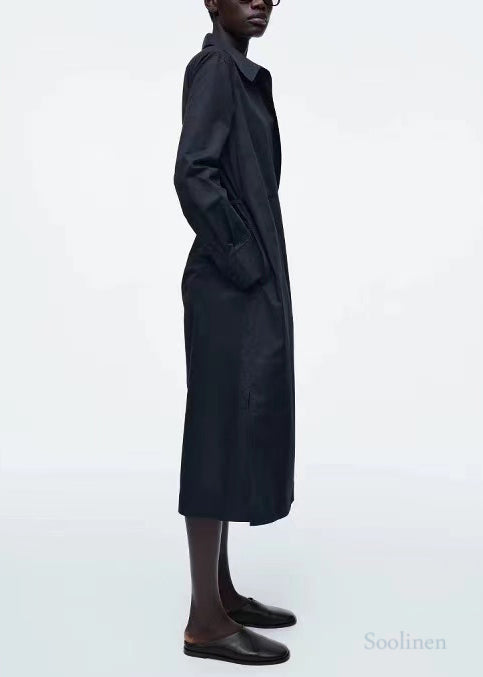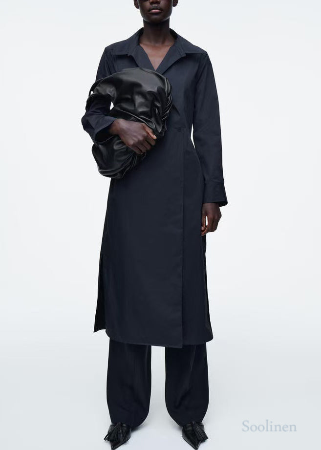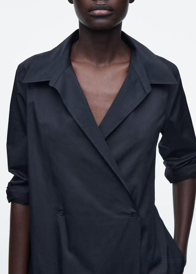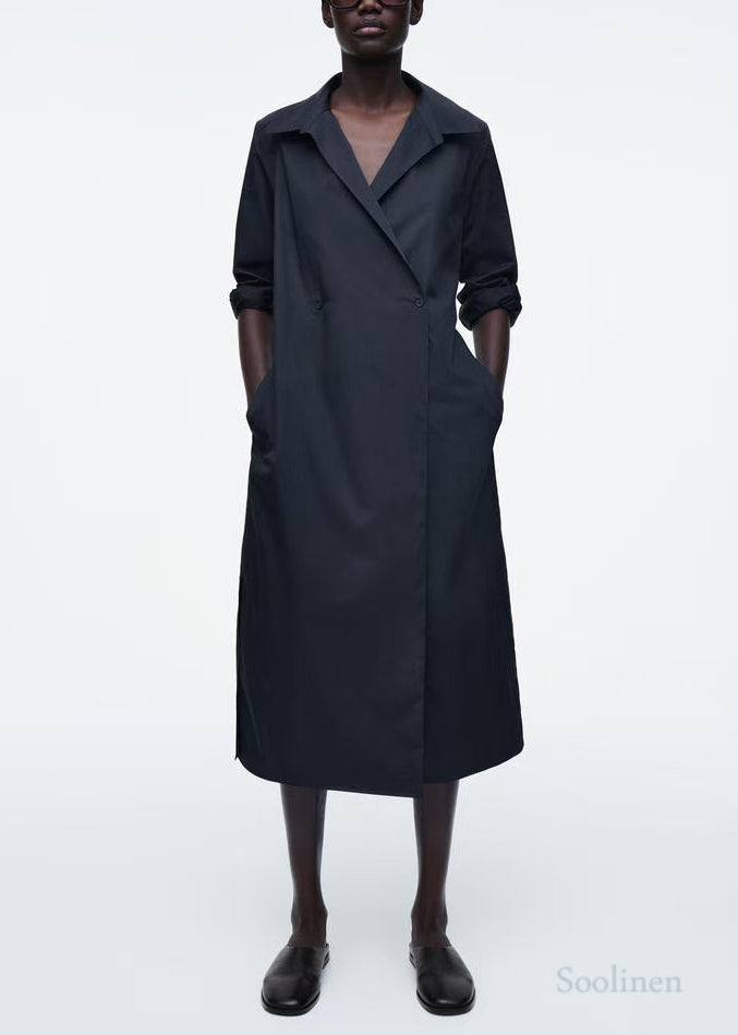 French Navy Oversized Double Breast Cotton Shirt Dresses Fall