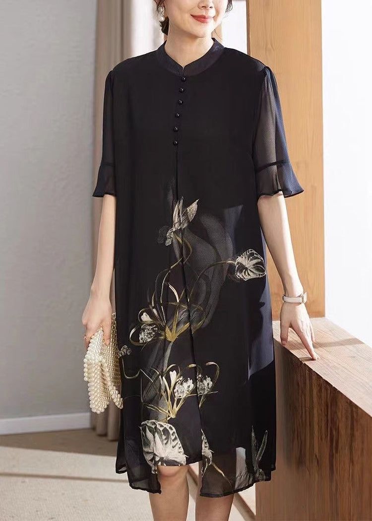 French Navy Print False Chiffon Two Pieces Dress Half Sleeve