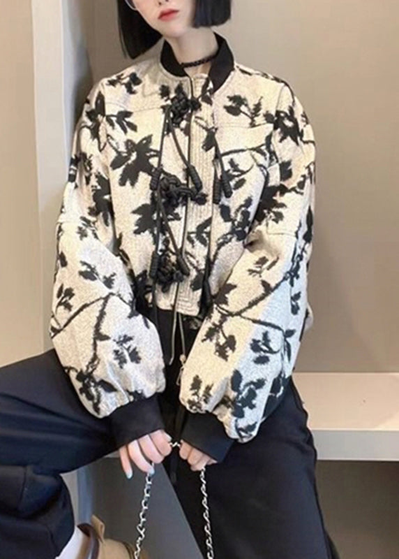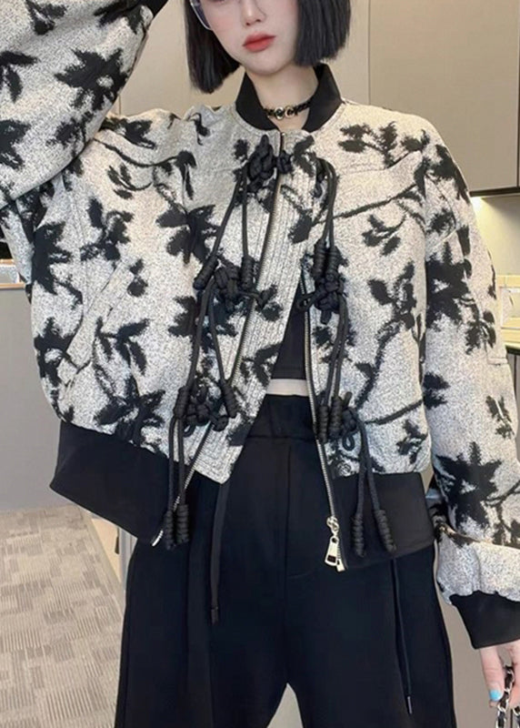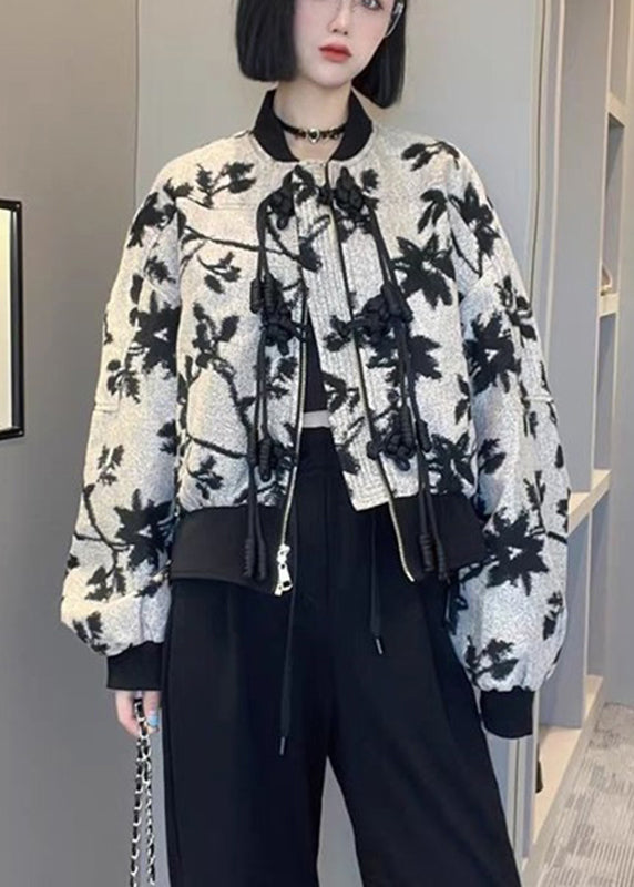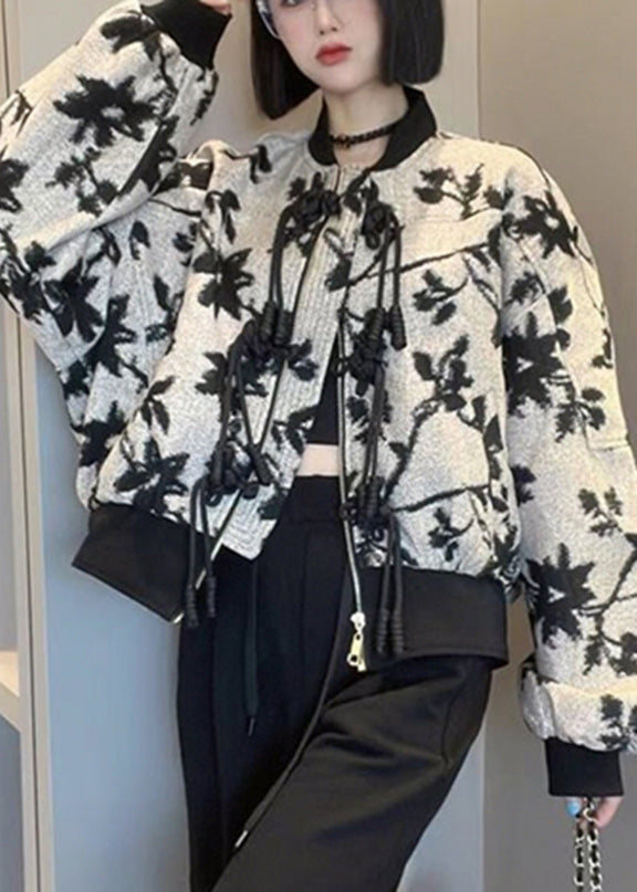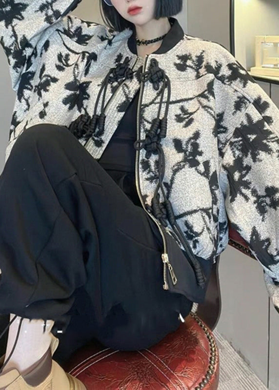 French O-Neck Zippered Print Coats Long Sleeve