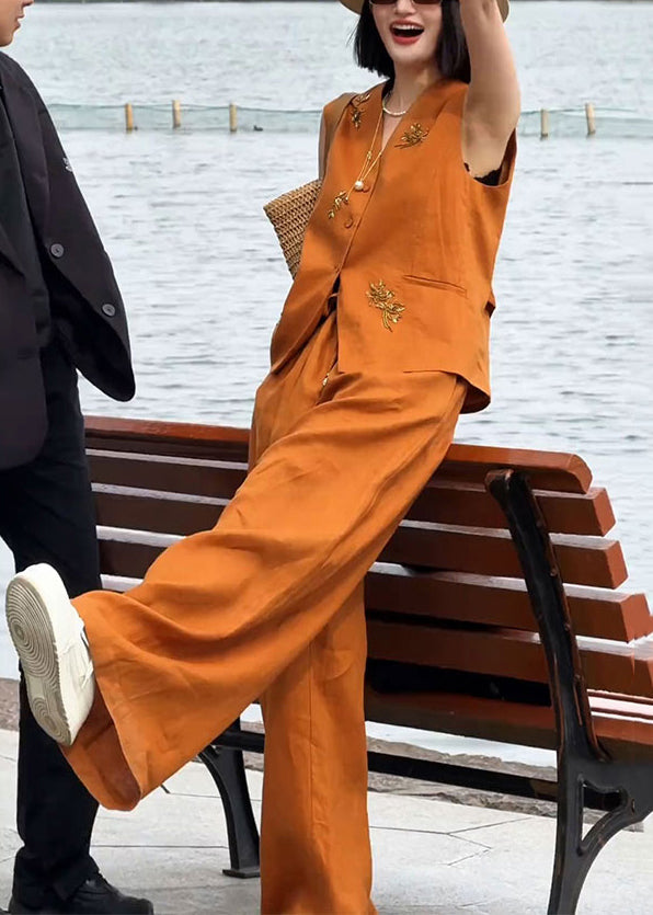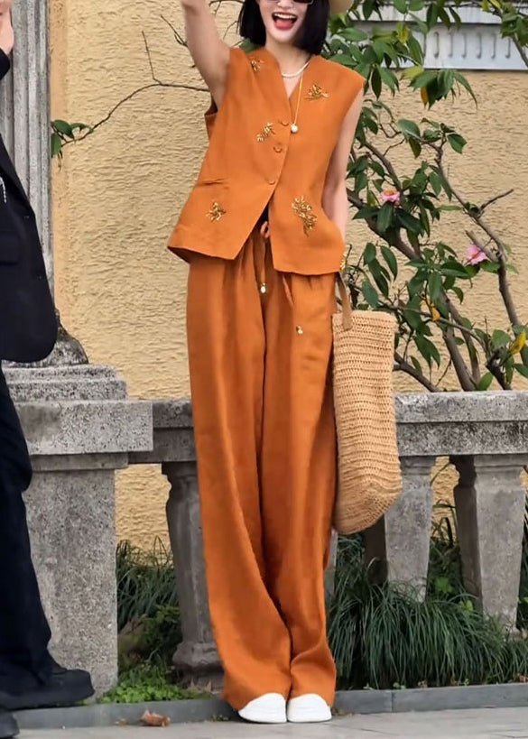 French Orange Nail Bead Waistcoat And Pants Linen Two Pieces Set Sleeveless