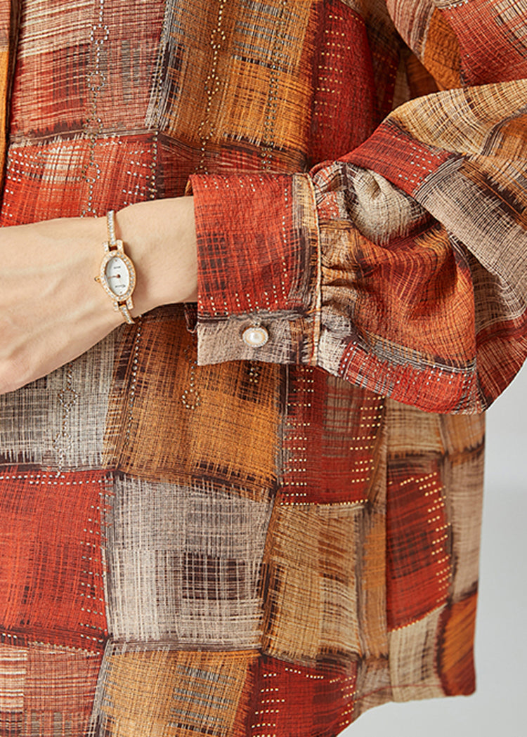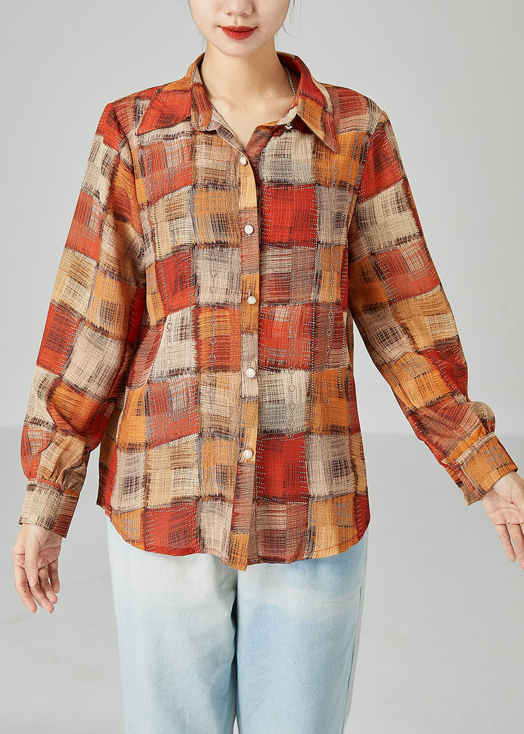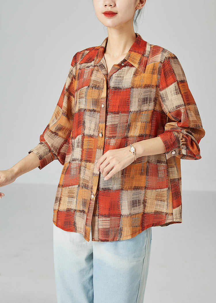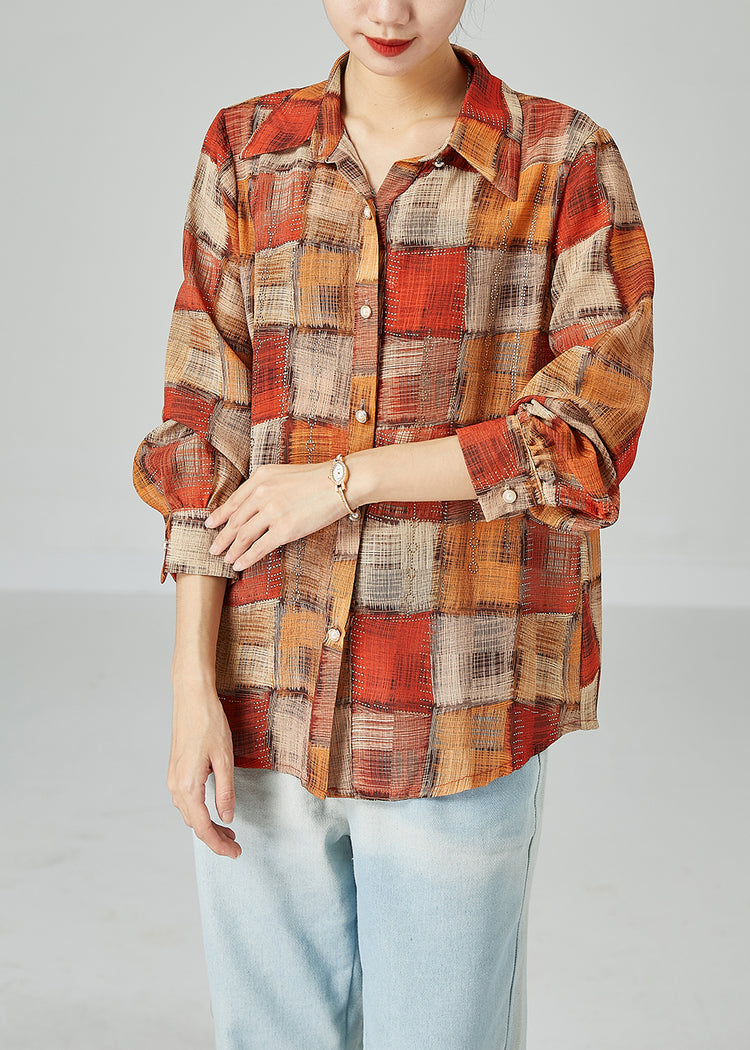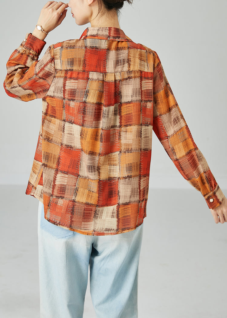 French Orange Peter Pan Collar Plaid Cotton Blouse Top Spring