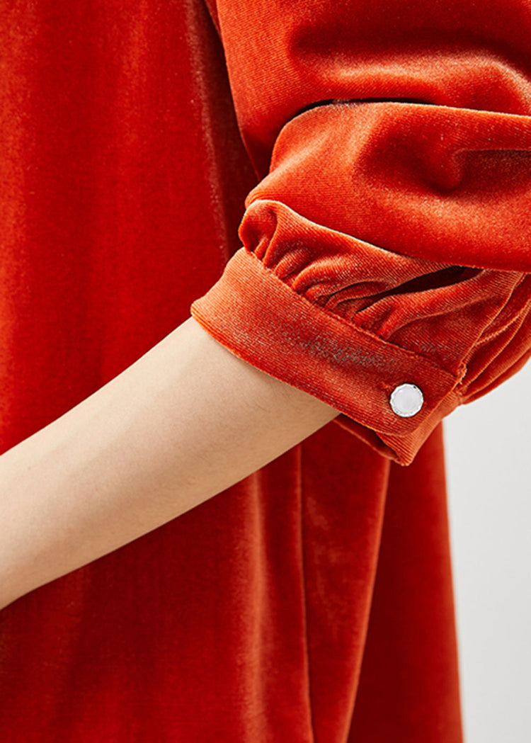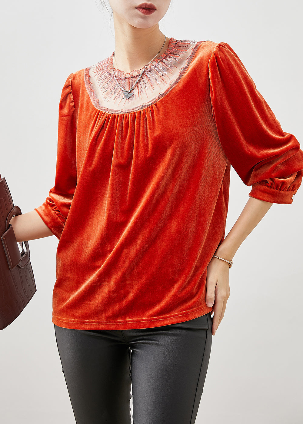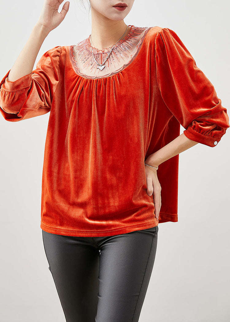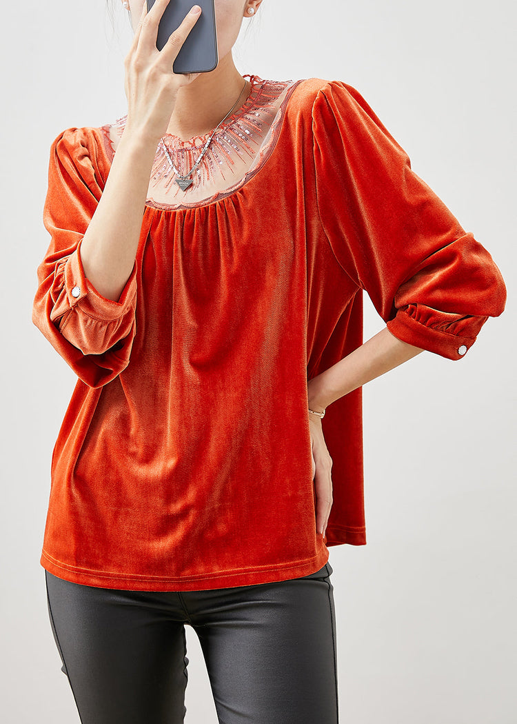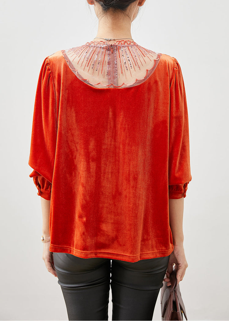 French Orange Sequins Patchwork Silk Velour Shirts Fall