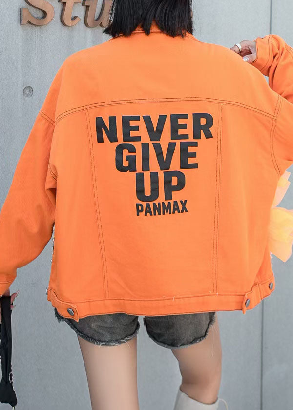 French Orange Tulle Pockets Sequins Nail Bead Patchwork Denim Coat Spring