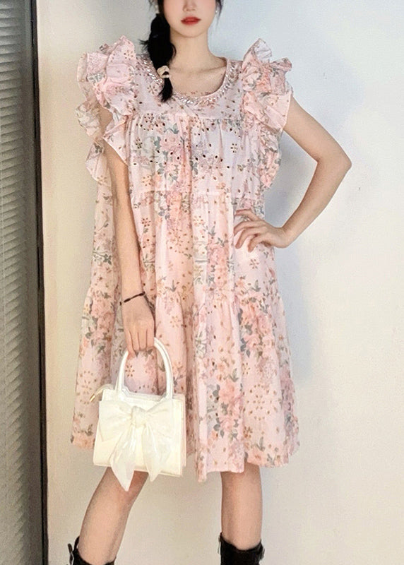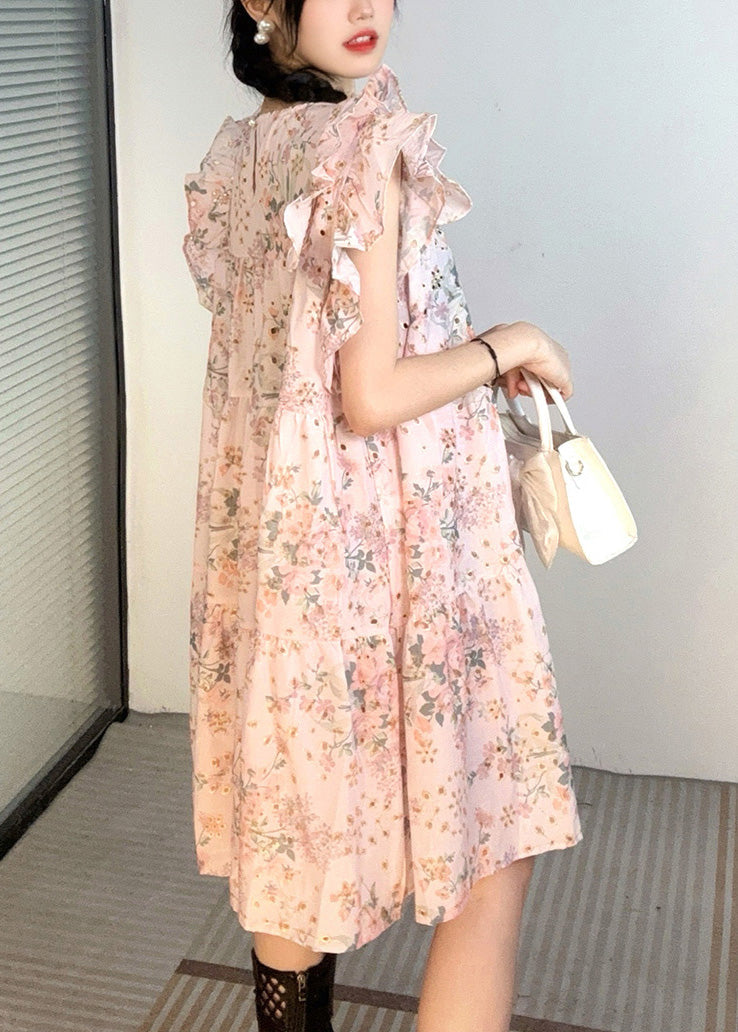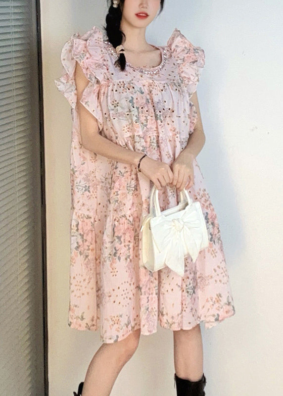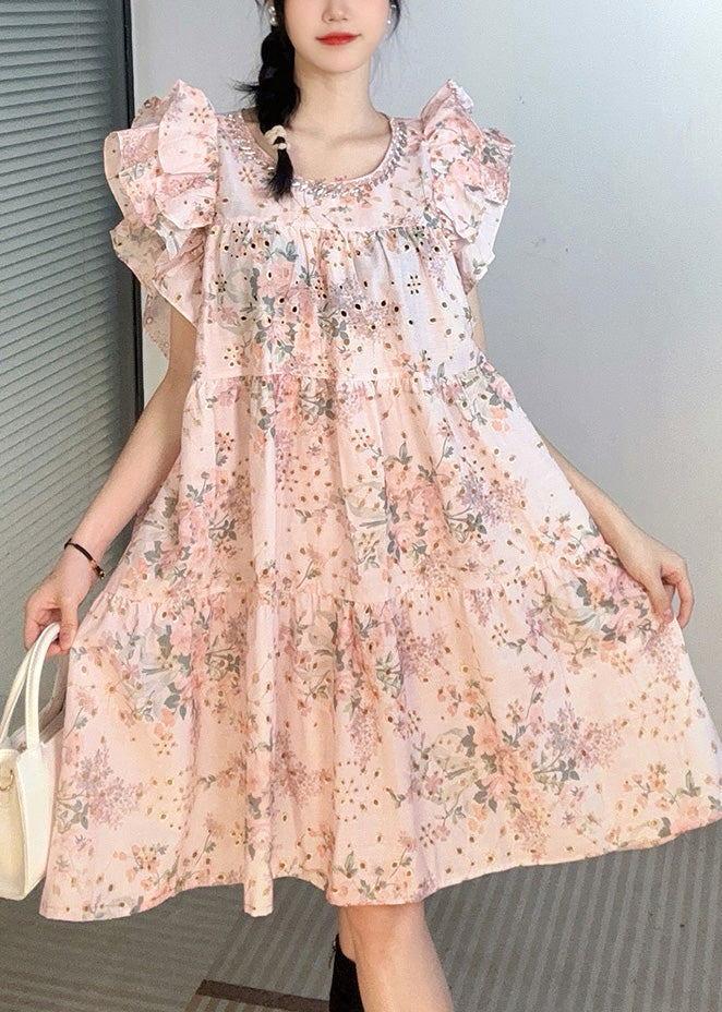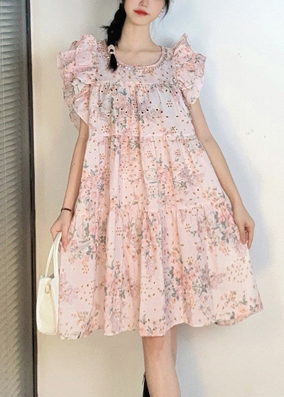 French Pink O-Neck Print Cotton Mid Dresses Petal Sleeve