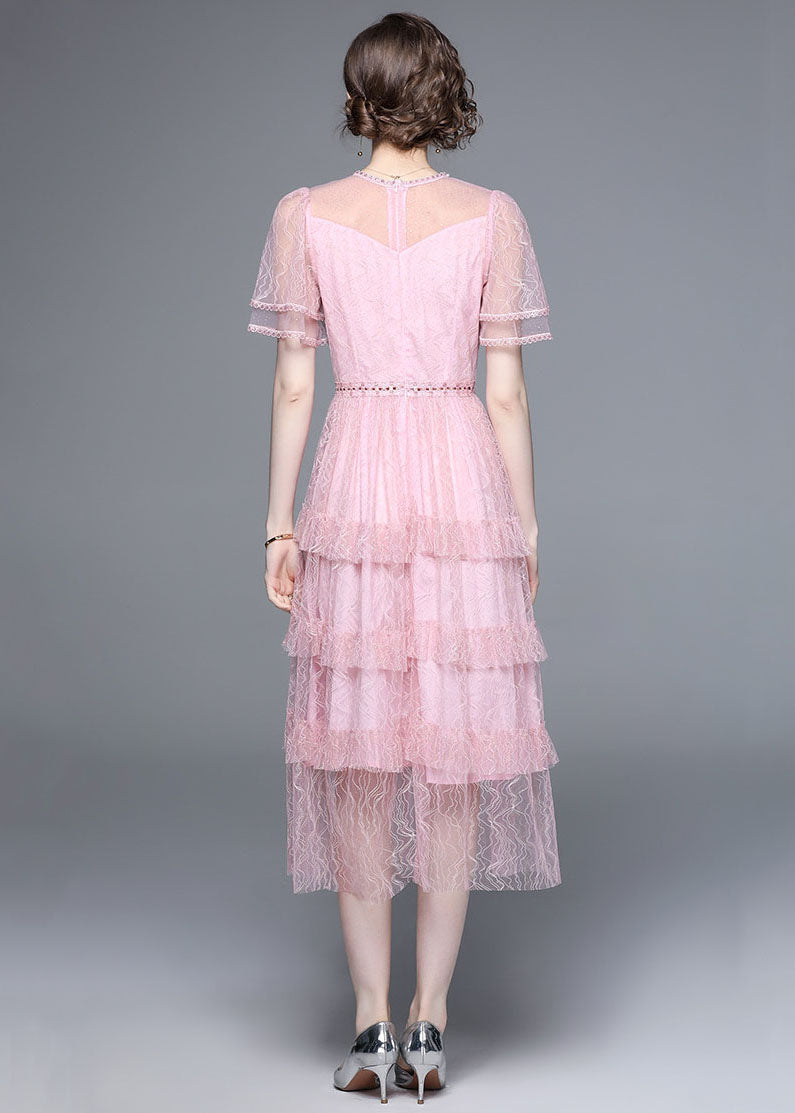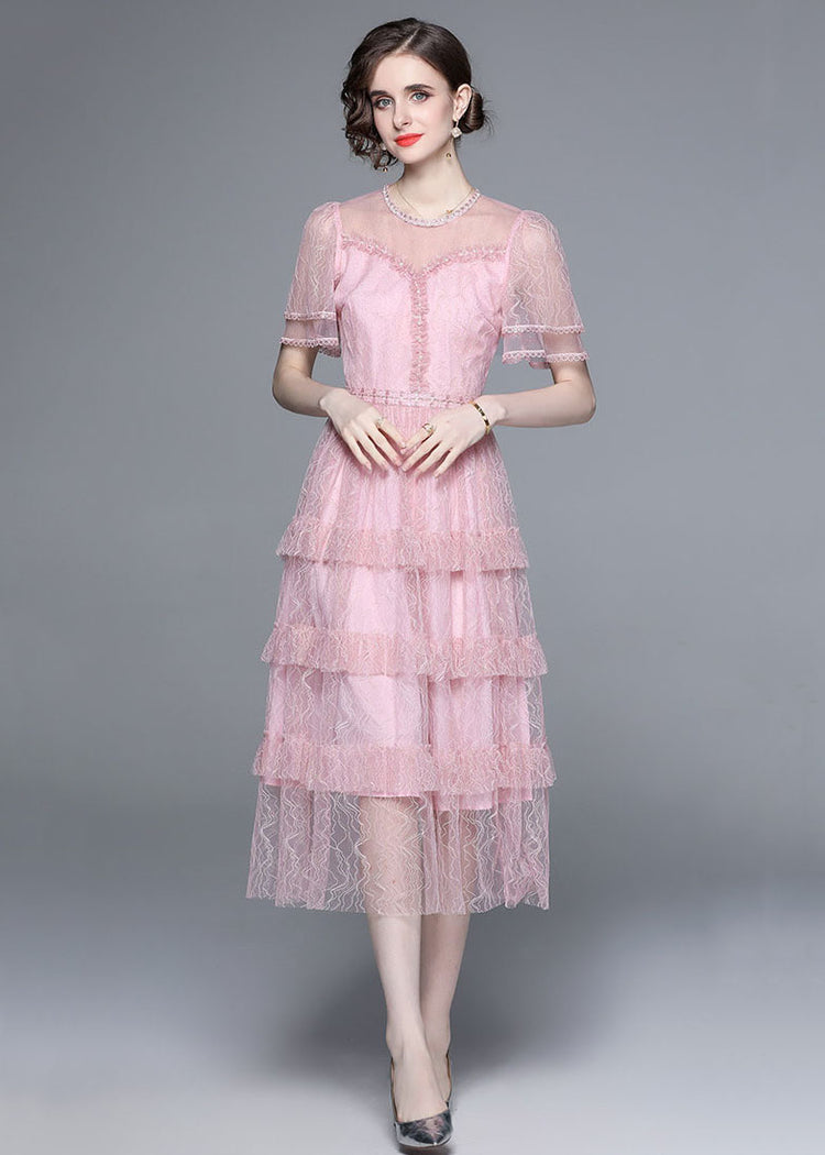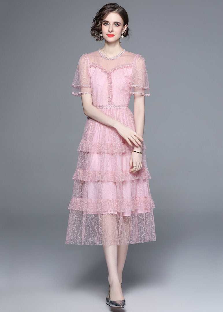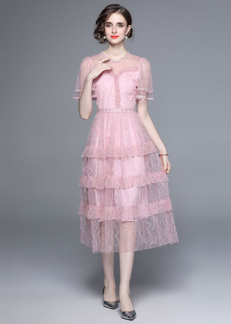 French Pink Ruffled Nail Bead Patchwork Tulle Long Dresses Summer