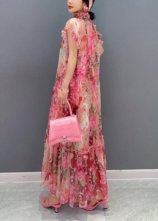 French Pink Ruffled Print Chiffon Dress Two Pieces Set Summer
