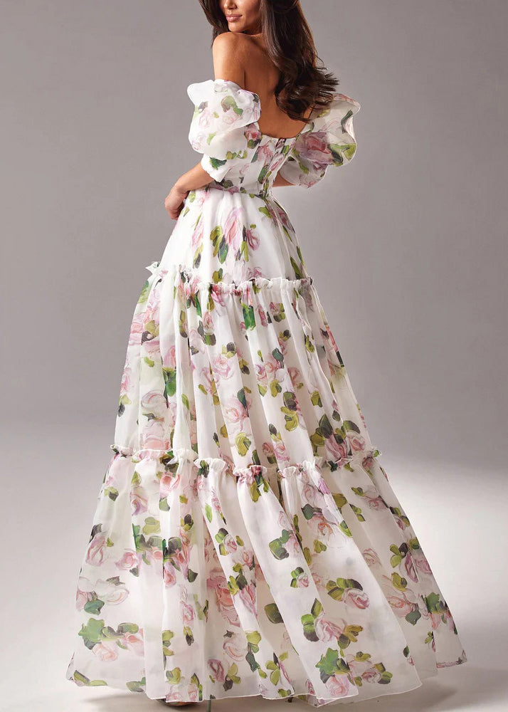 French Pink Ruffled Print Chiffon Long Dresses Summer