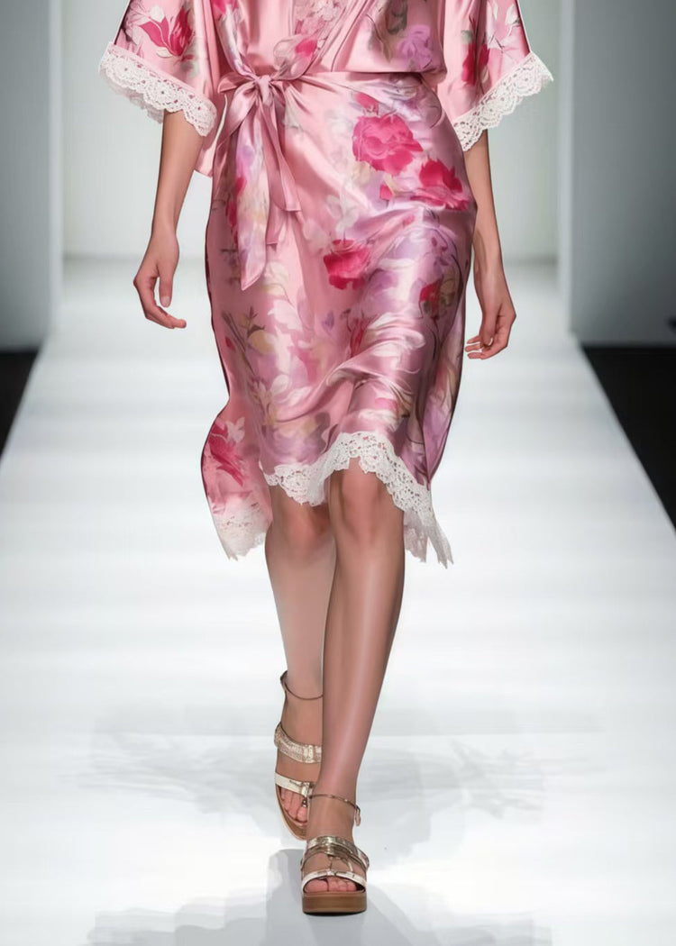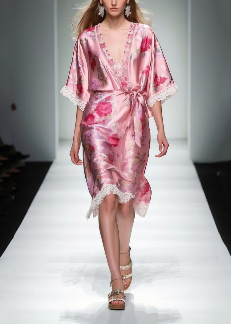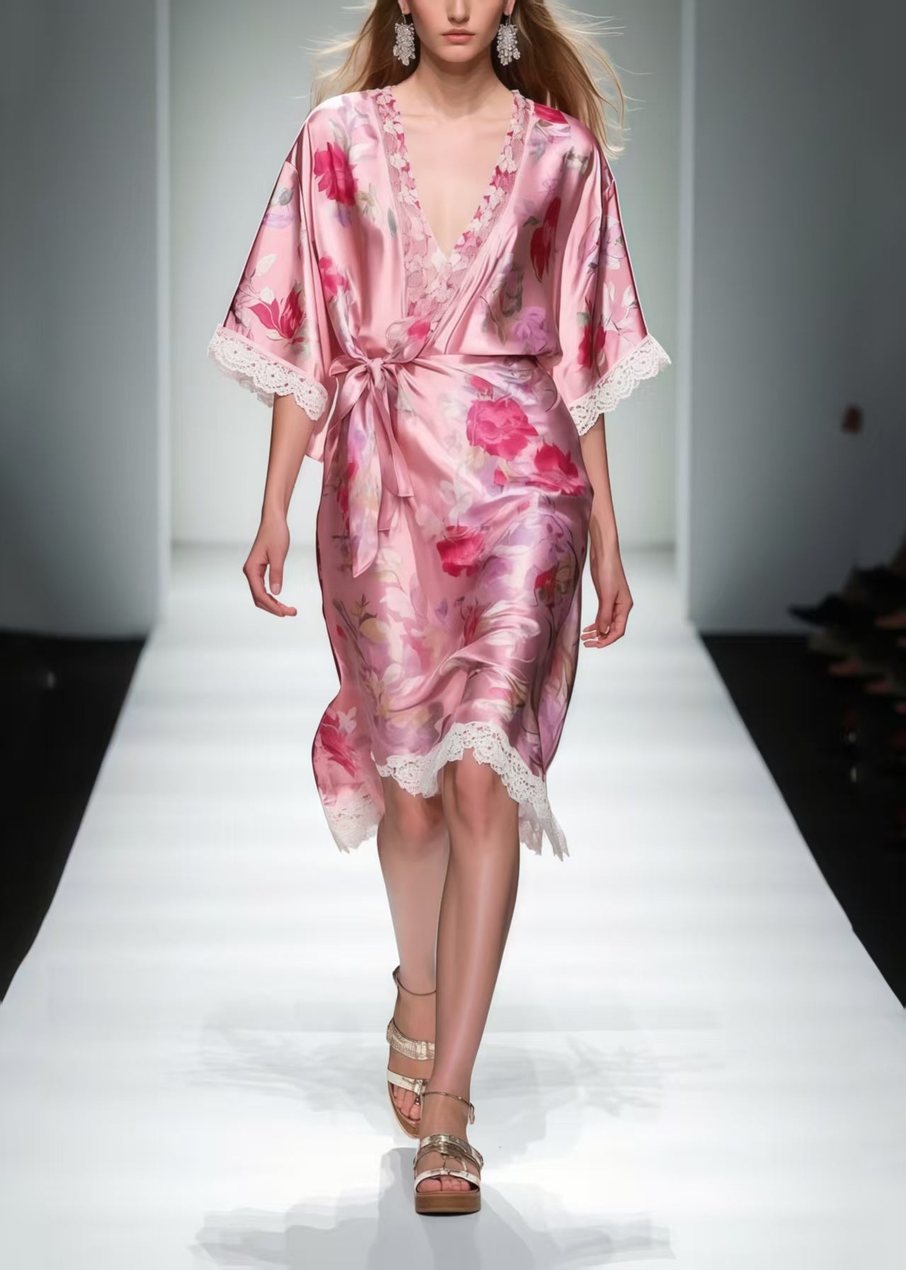 French Pink Tie Waist Patchwork Lace Mid Dress Summer