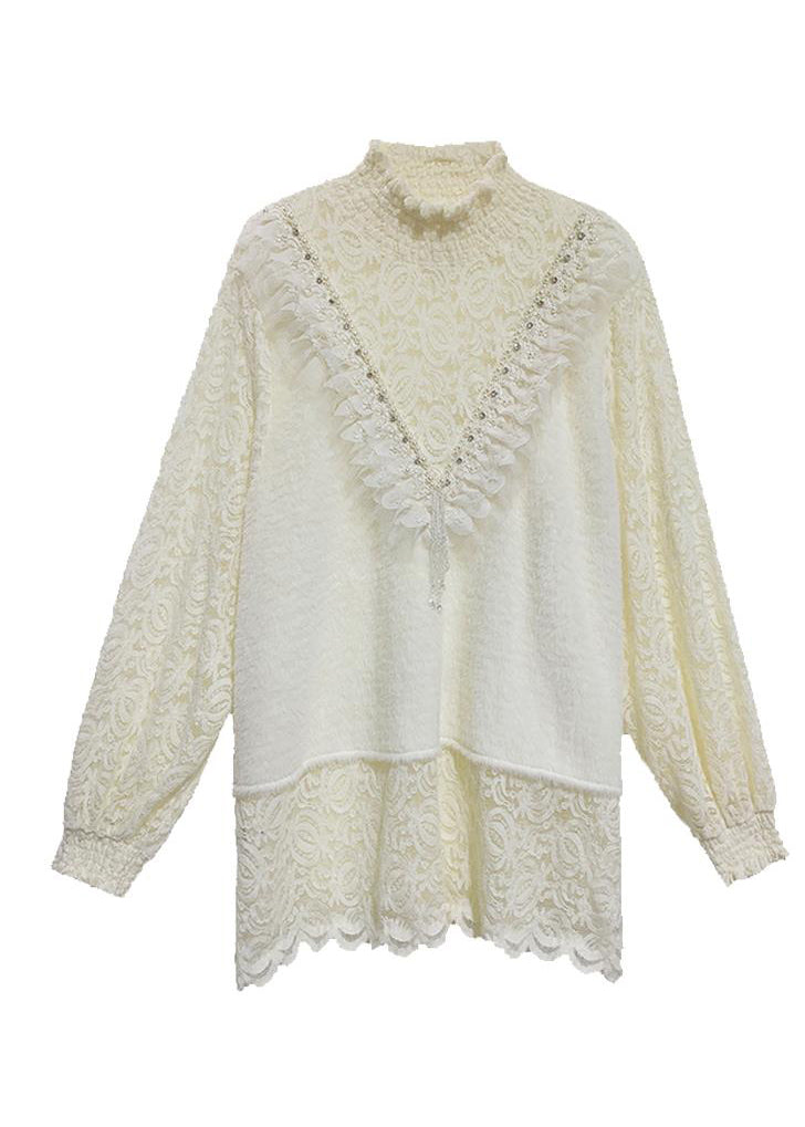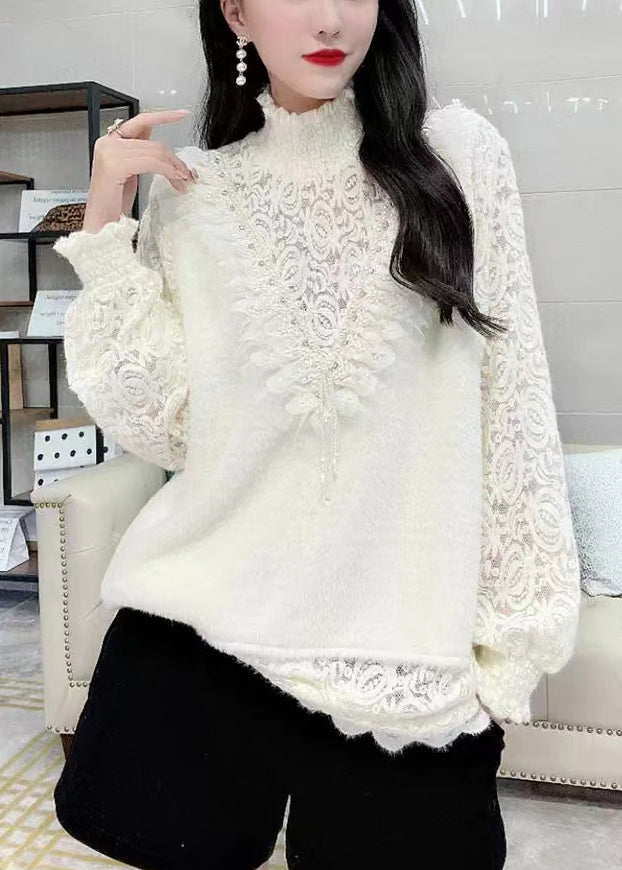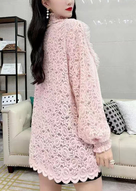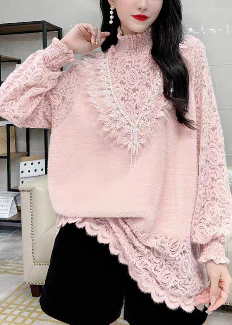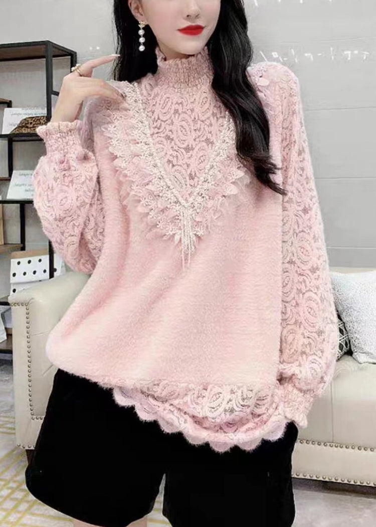 French Pink Turtleneck Nail Bead Lace Warm Fleece Top Winter