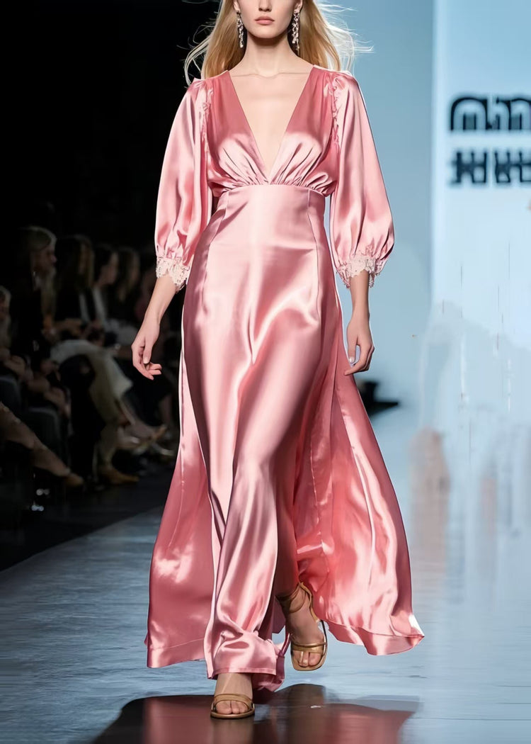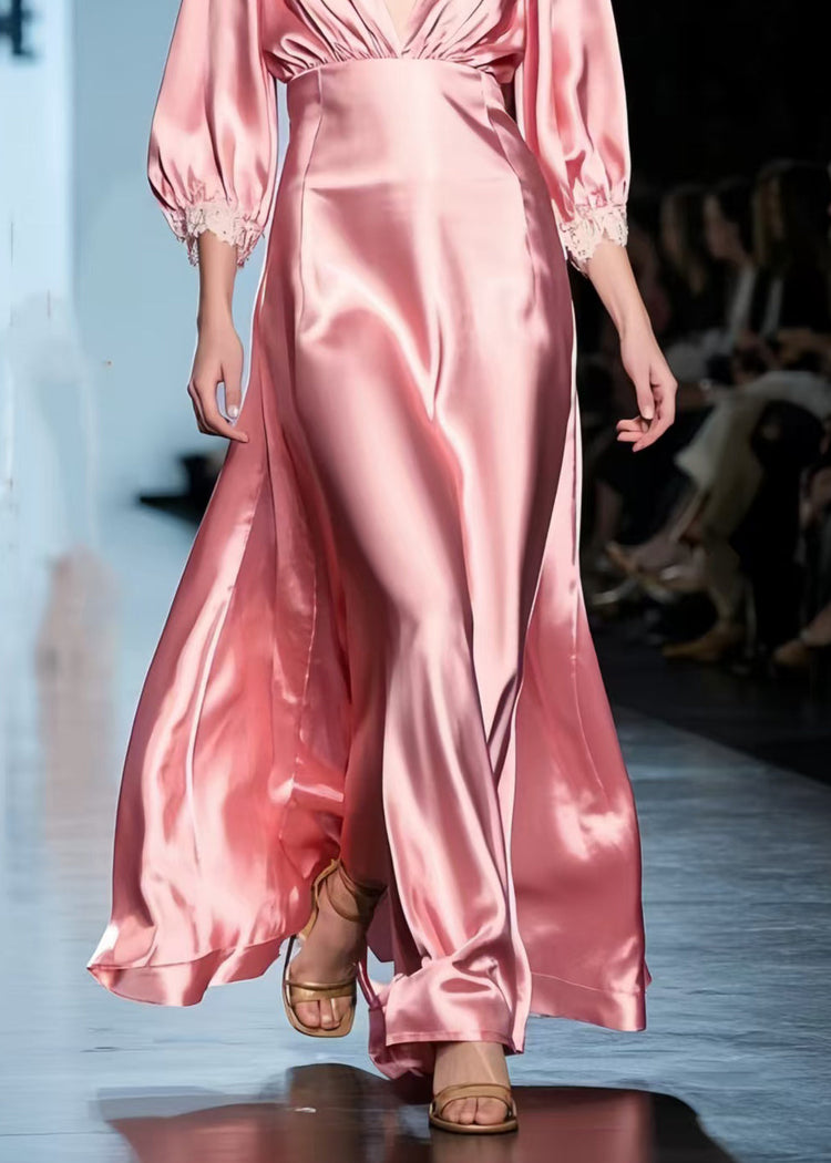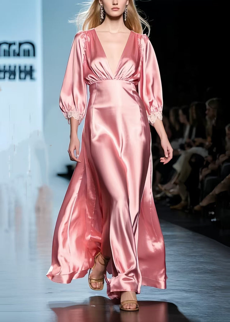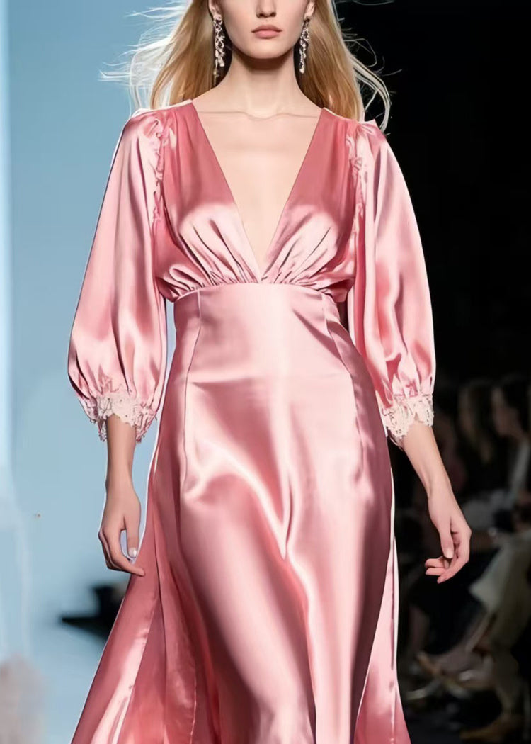 French Pink V Neck Exra Large Hem Party Dress Bracelet Sleeve