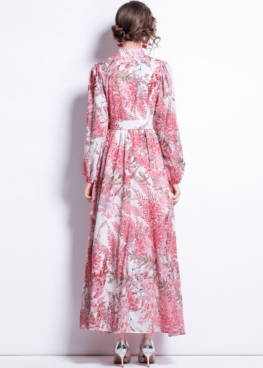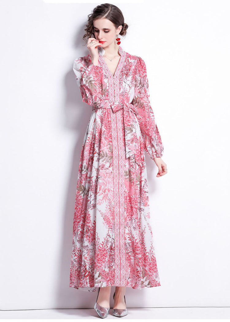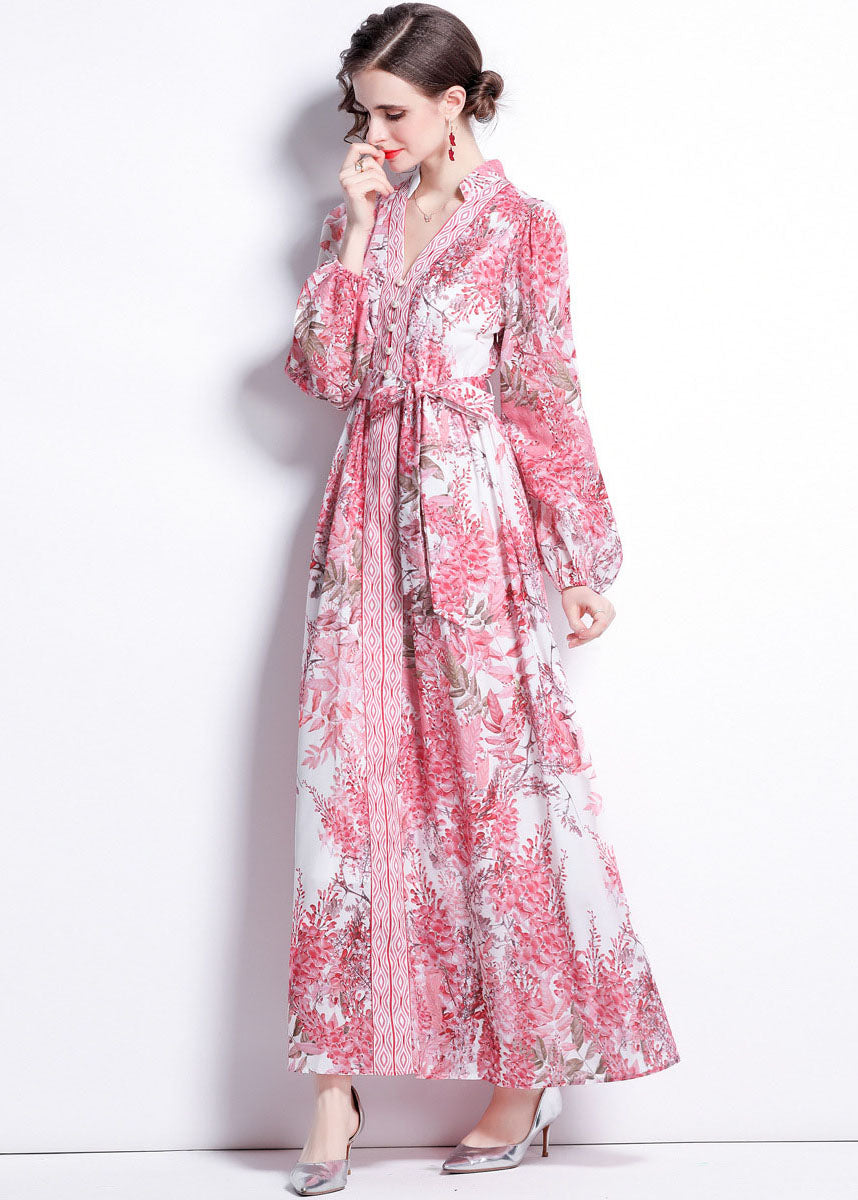French Pink V Neck Tie Waist Print Patchwork Cotton Long Dresses Lantern Sleeve