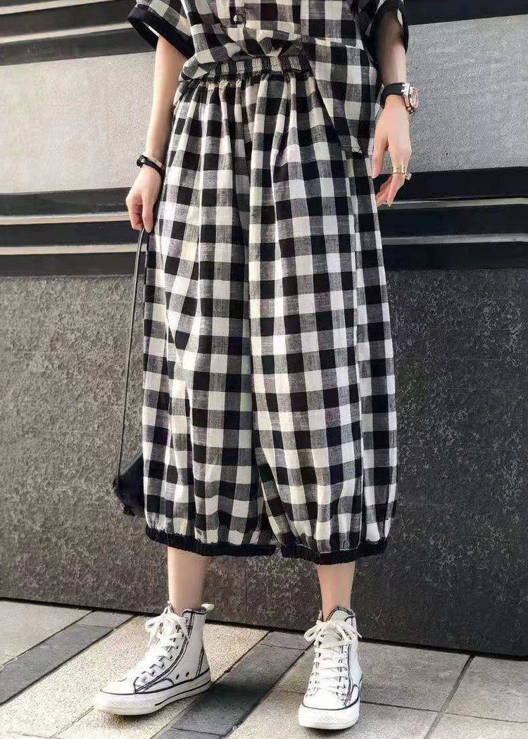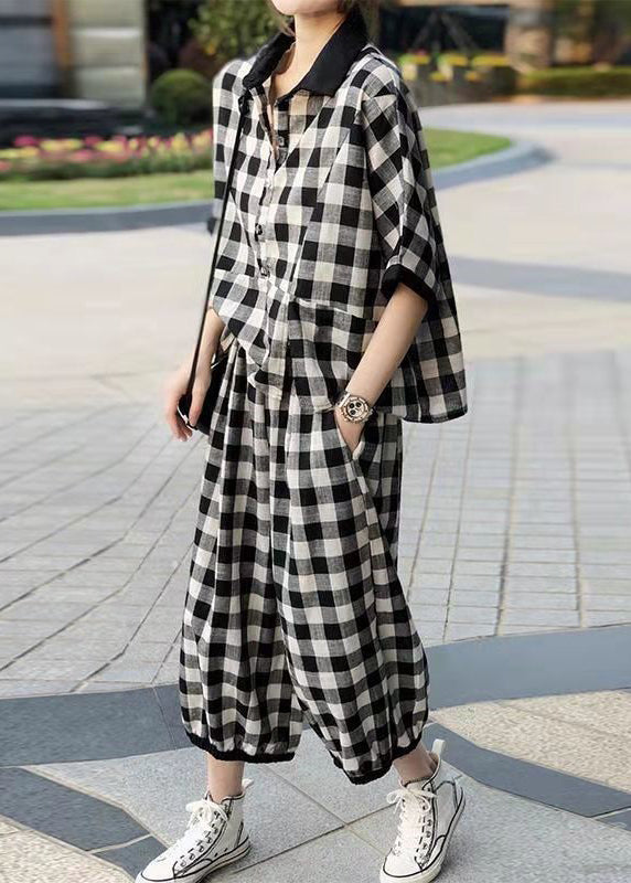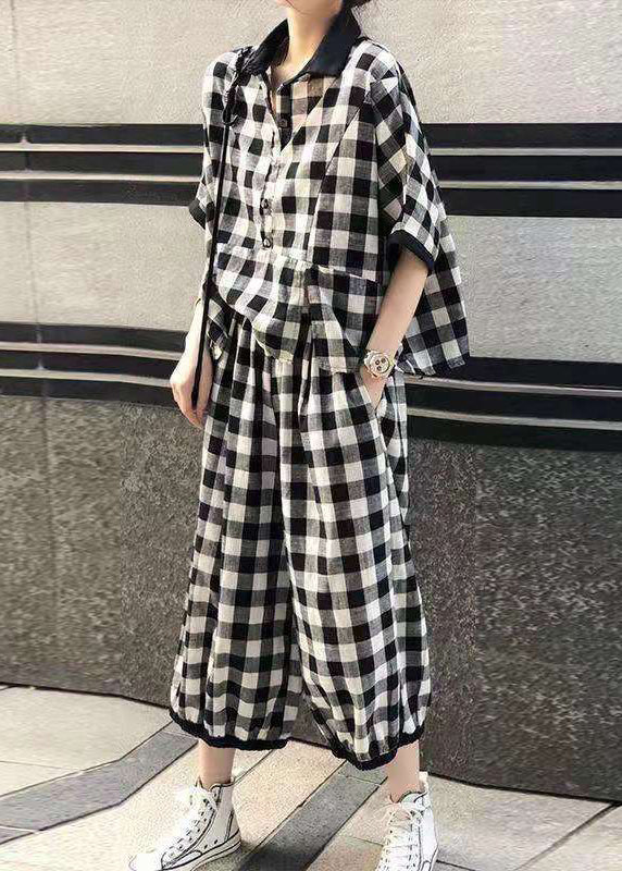 French Plaid Button Pockets Cotton Two Piece Set Half Sleeve