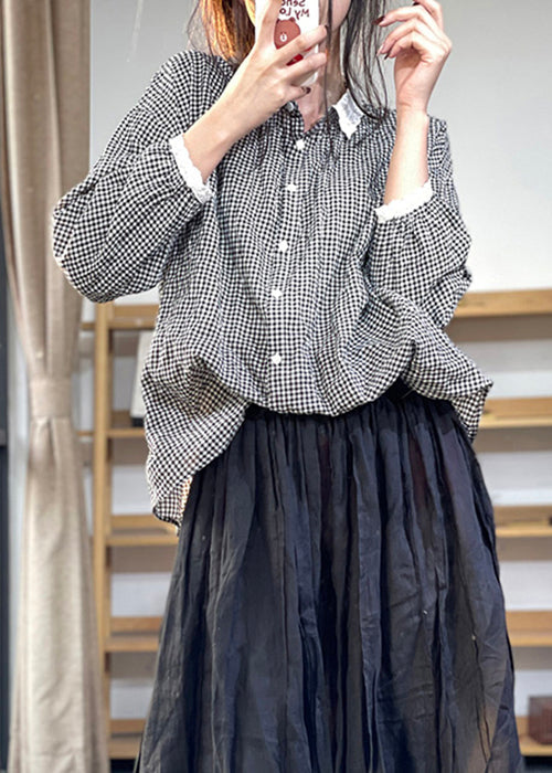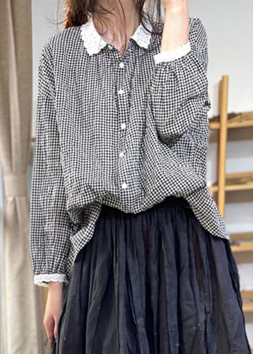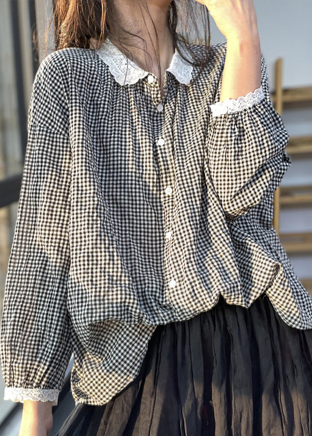 French Plaid Peter Pan Collar Lace Patchwork Cotton Shirt Fall