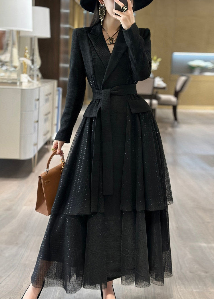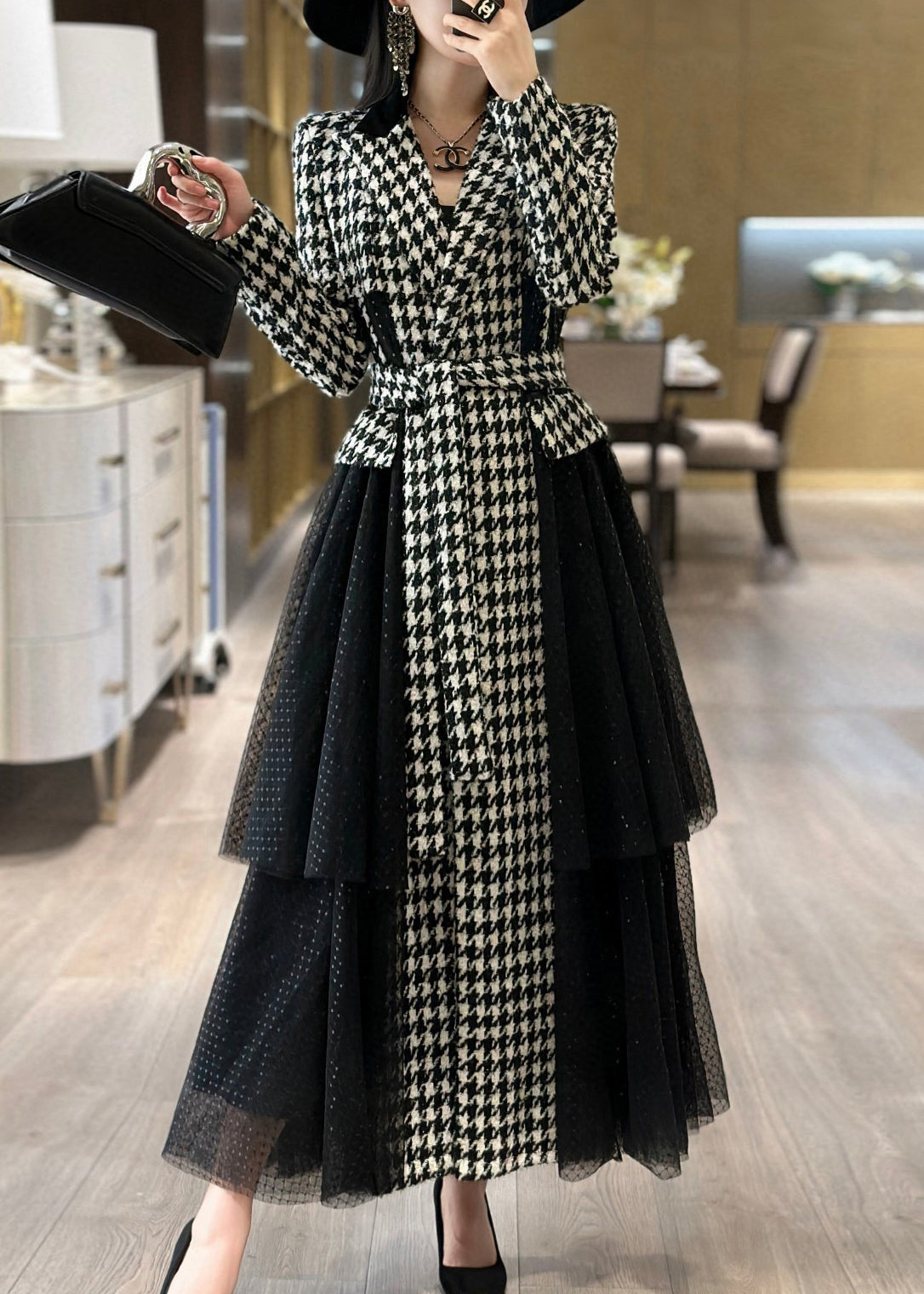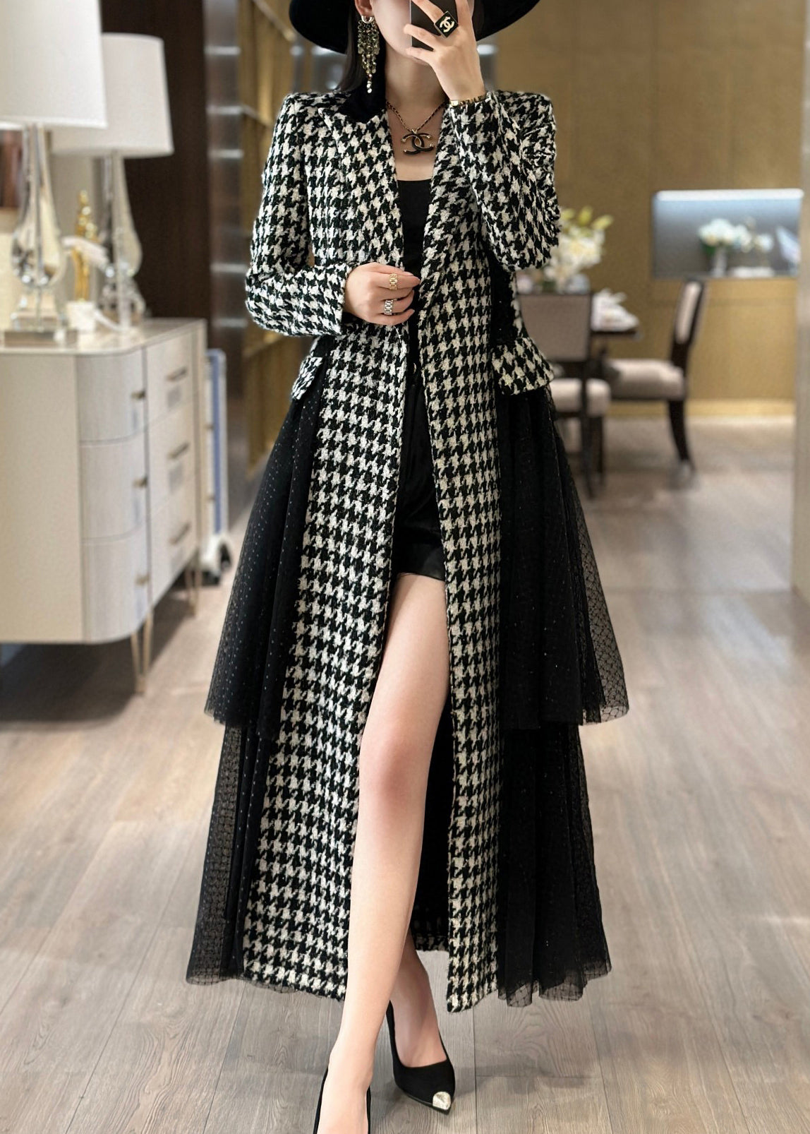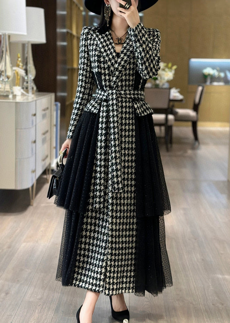 French Plaid Tie Waist Tulle Patchwork Long Trench Coat Fall