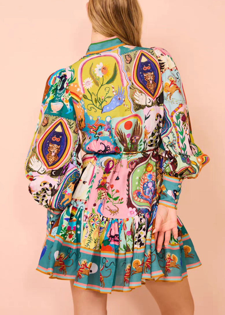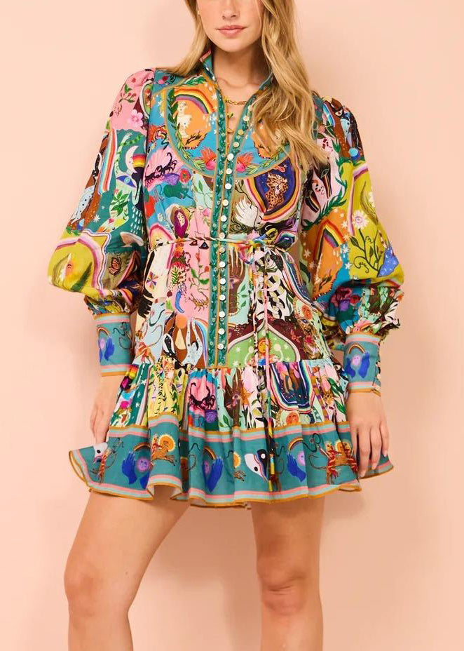 French Print Button Tie Waist Cotton Mid Dress Spring
