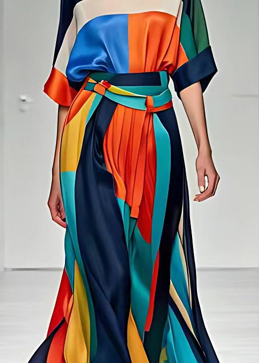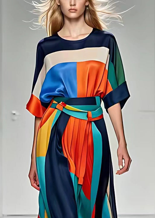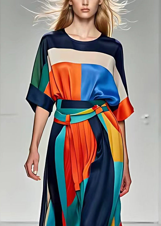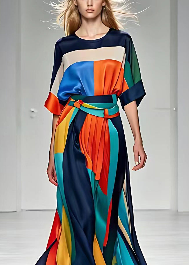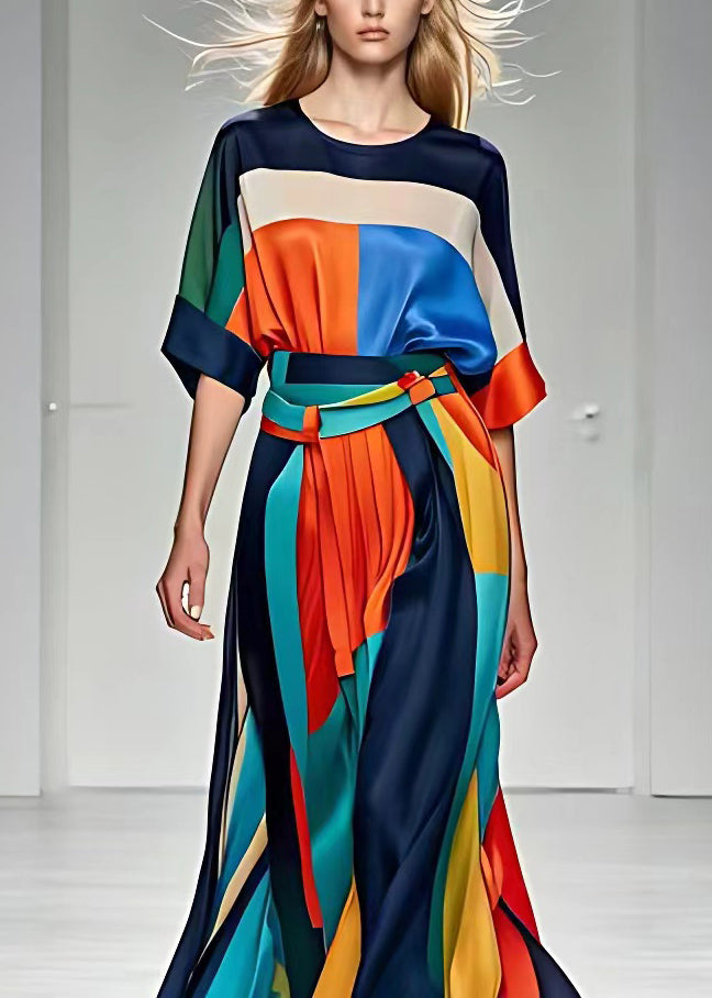 French Print Tops And High Waist Skirts Silk Two Pieces Set Half Sleeve