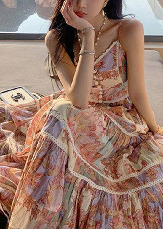 French Printed Patchwork Spaghetti Strap Long Dress Sleeveless