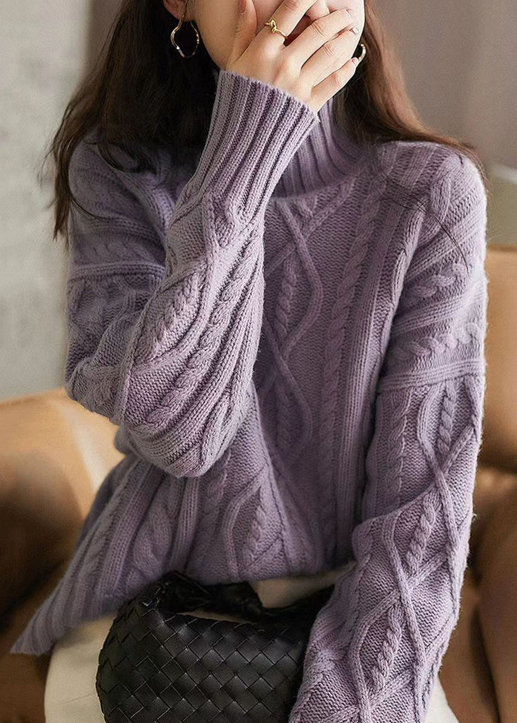 French Purple Hign Neck Patchwork Woolen Cable Knit Sweaters Winter