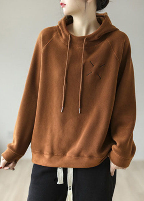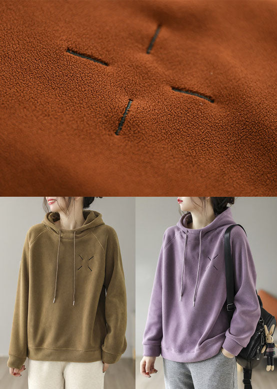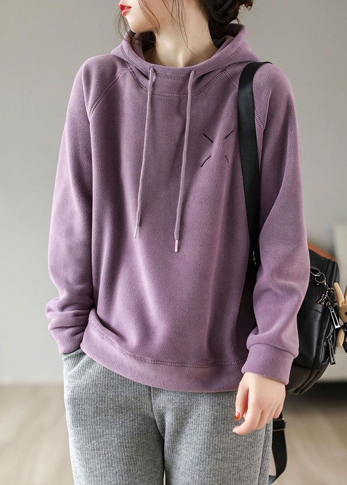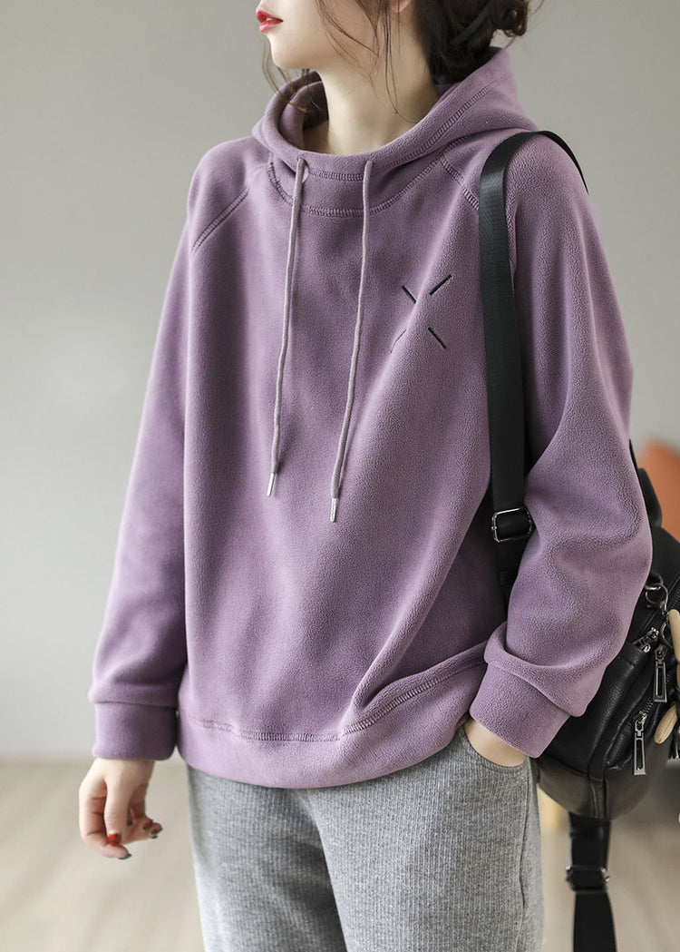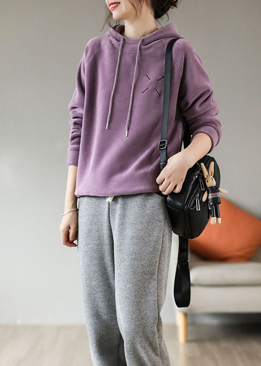 French Purple Hooded Embroideried Fleece Wool Lined Pullover Sweatshirt Spring