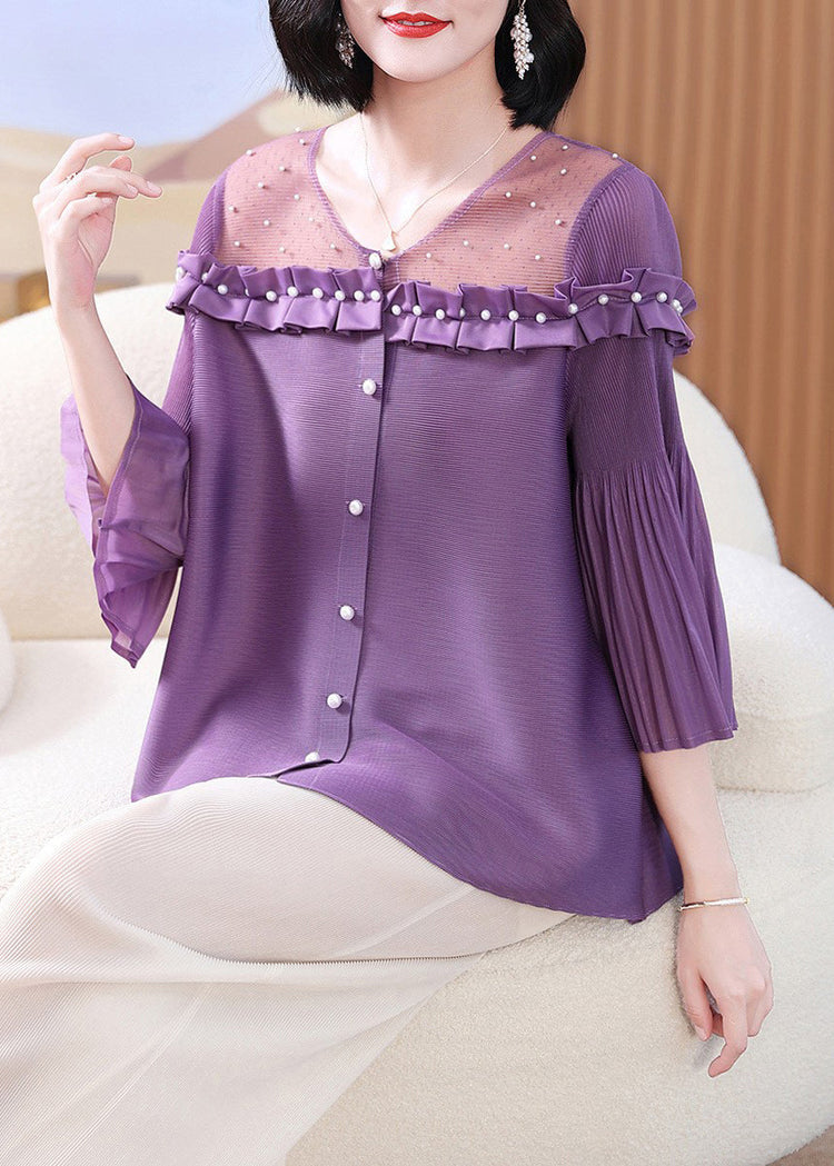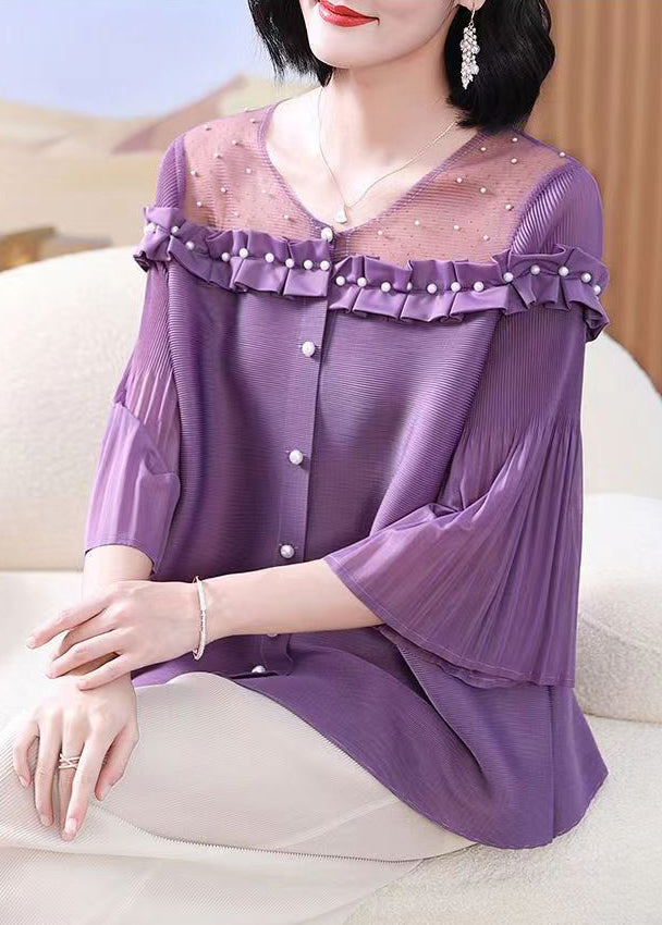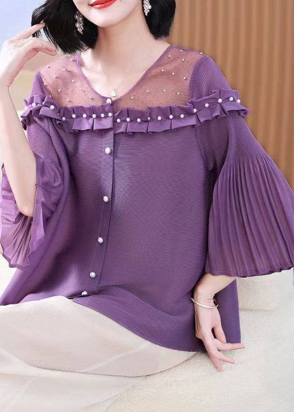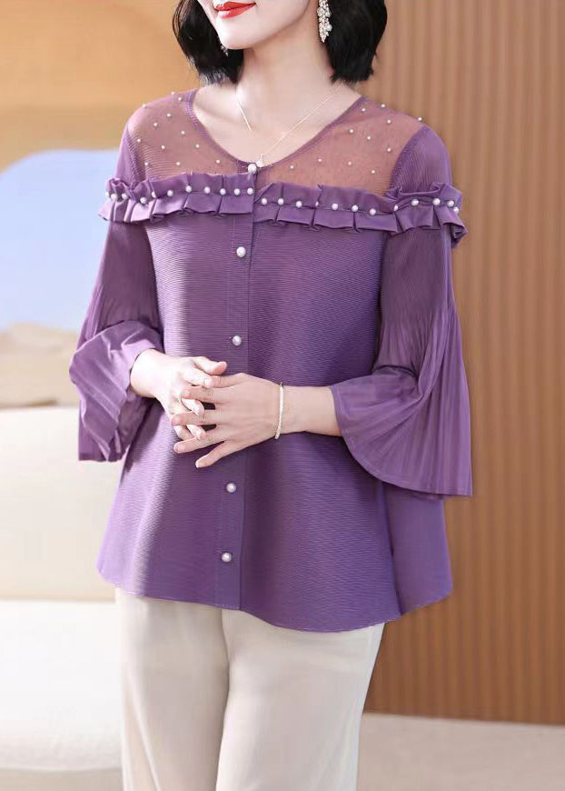 French Purple O Neck Nail Bead Patchwork Cotton Shirts Flare Sleeve