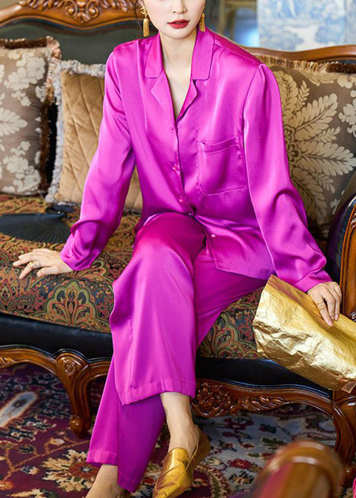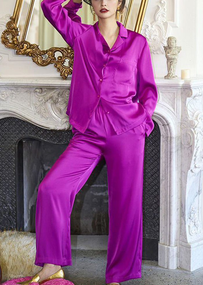 French Purple Peter Pan Collar Pocket Ice Silk Pajamas Two Pieces Set Spring