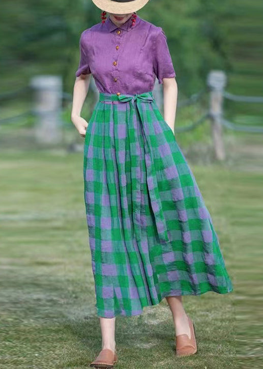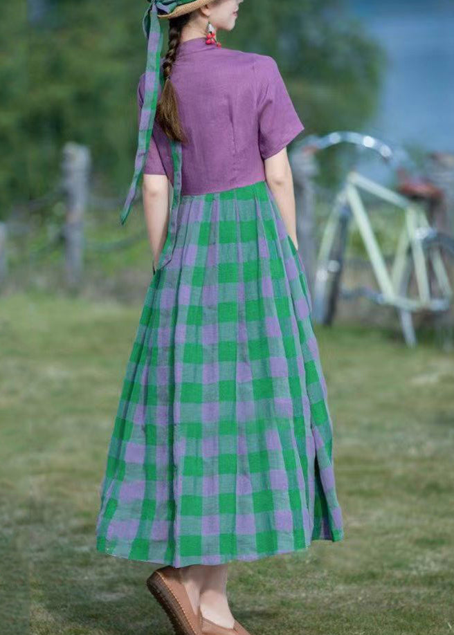 French Purple Plaid Lace Up Patchwork Cotton Long Dress Summer
