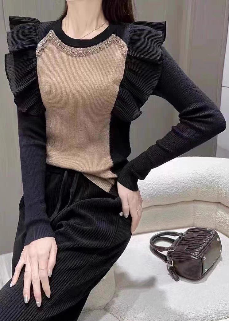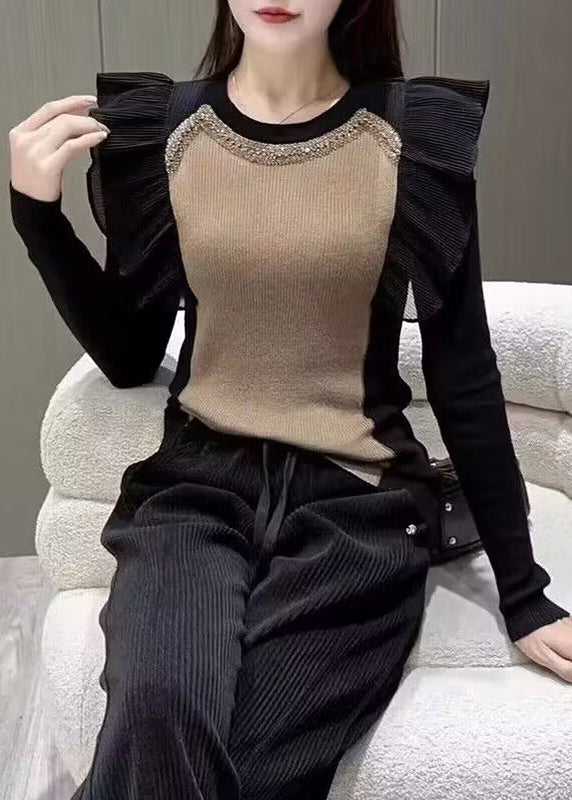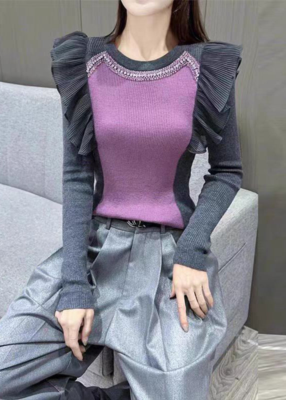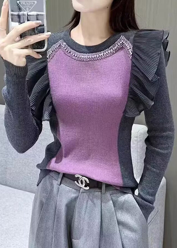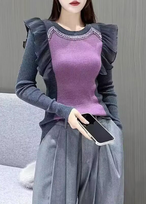 French Purple Ruffled Nail Bead Patchwork Knit Top Long Sleeve