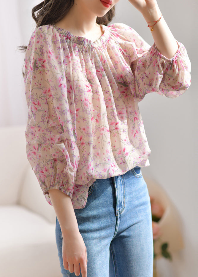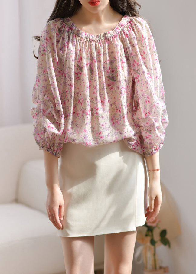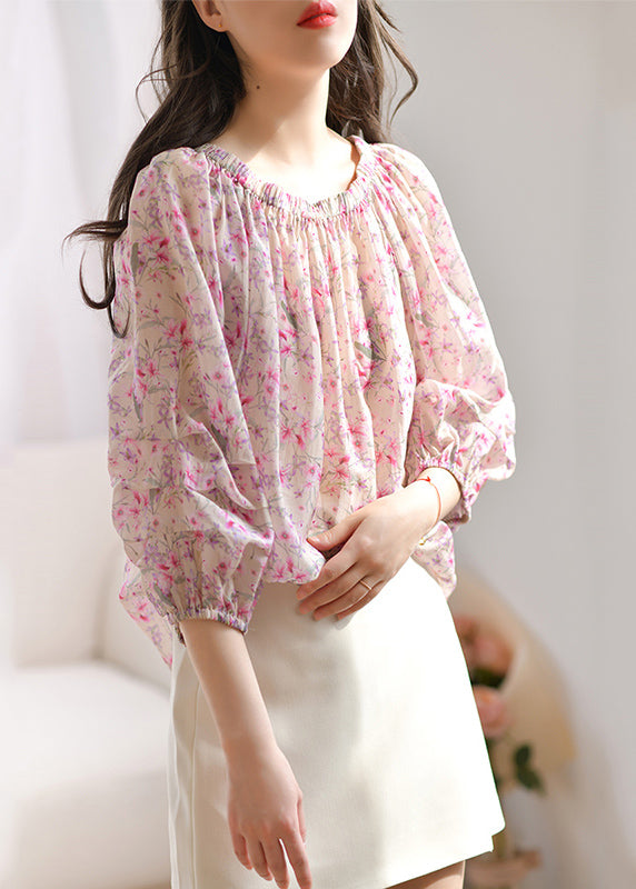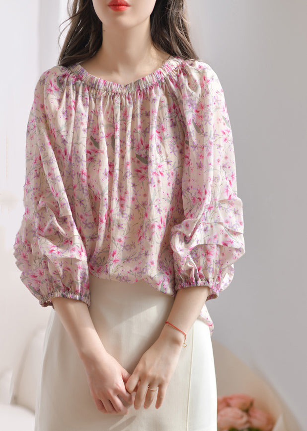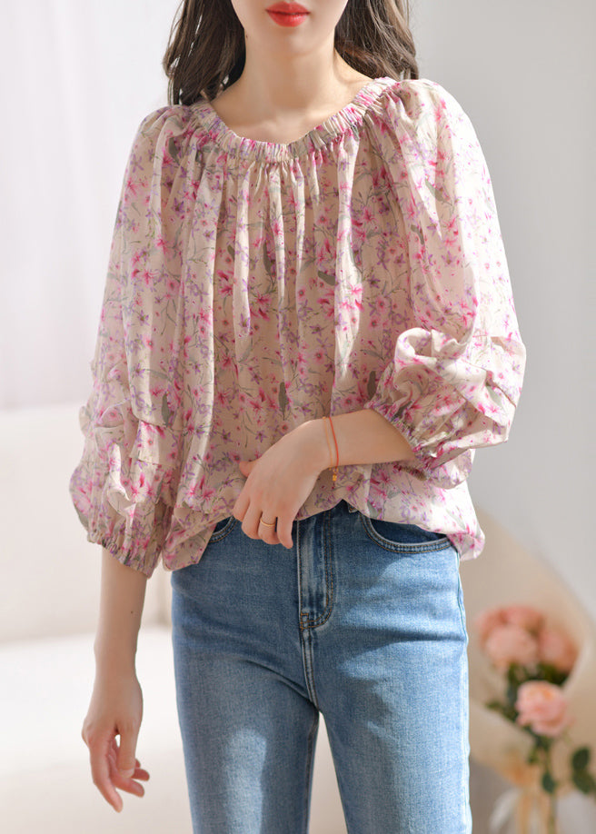 French Purple Ruffled Print Silk Blouses Bracelet Sleeve