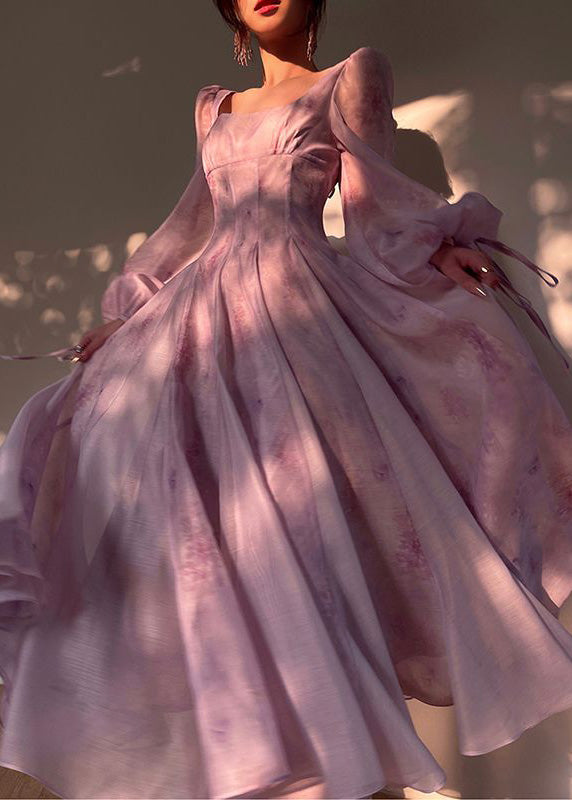 French Purple Square Collar Patchwork Chiffon Dress Lantern Sleeve