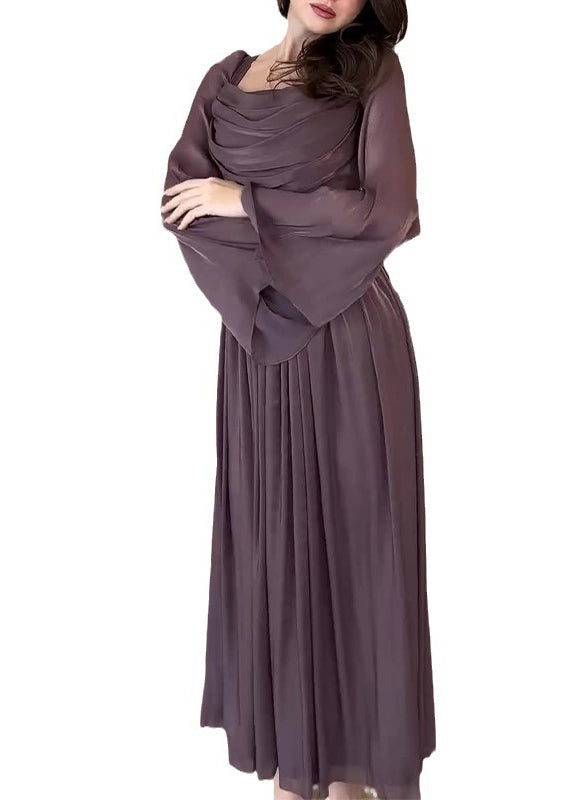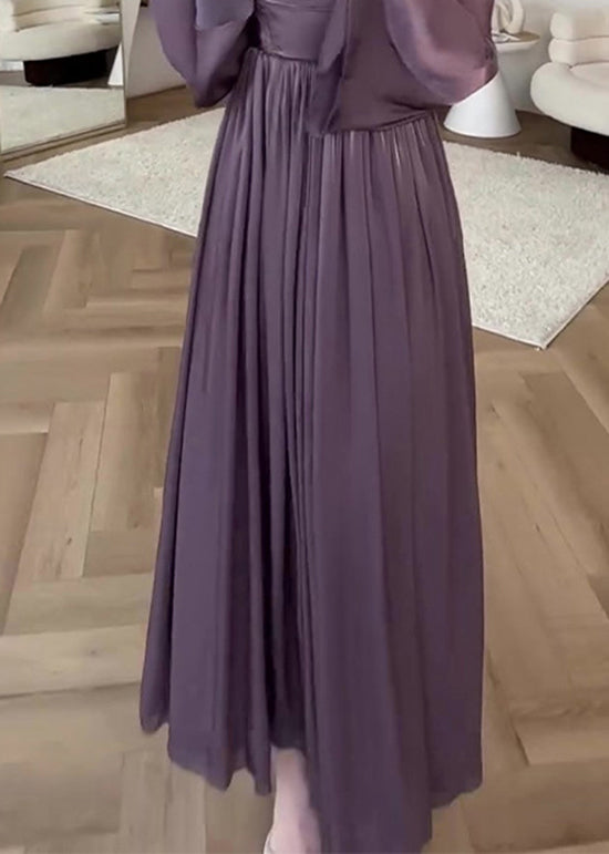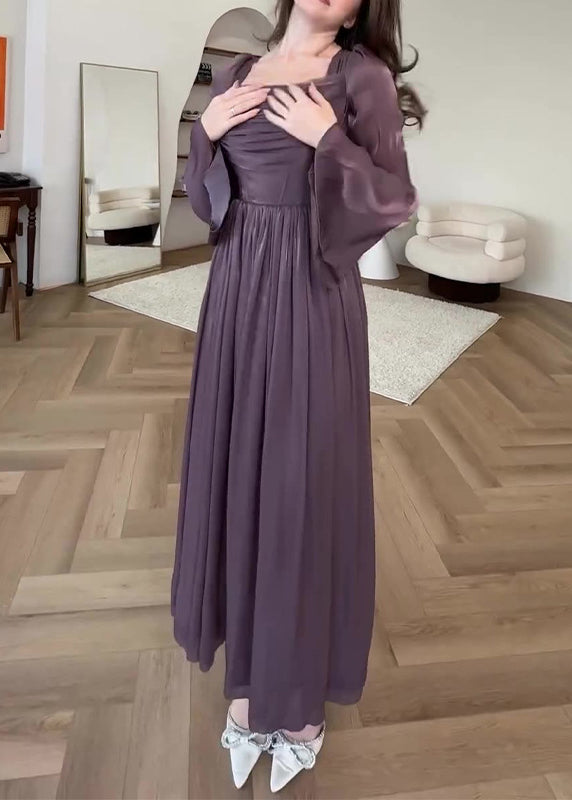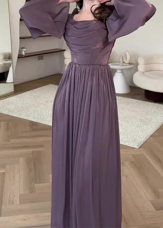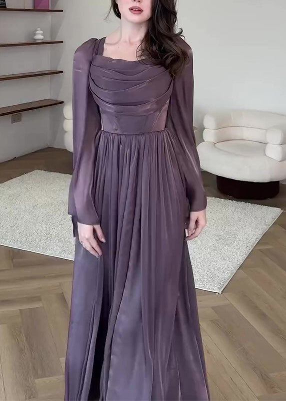 French Purple Square Collar Wrinkled Silk Long Dress Fall