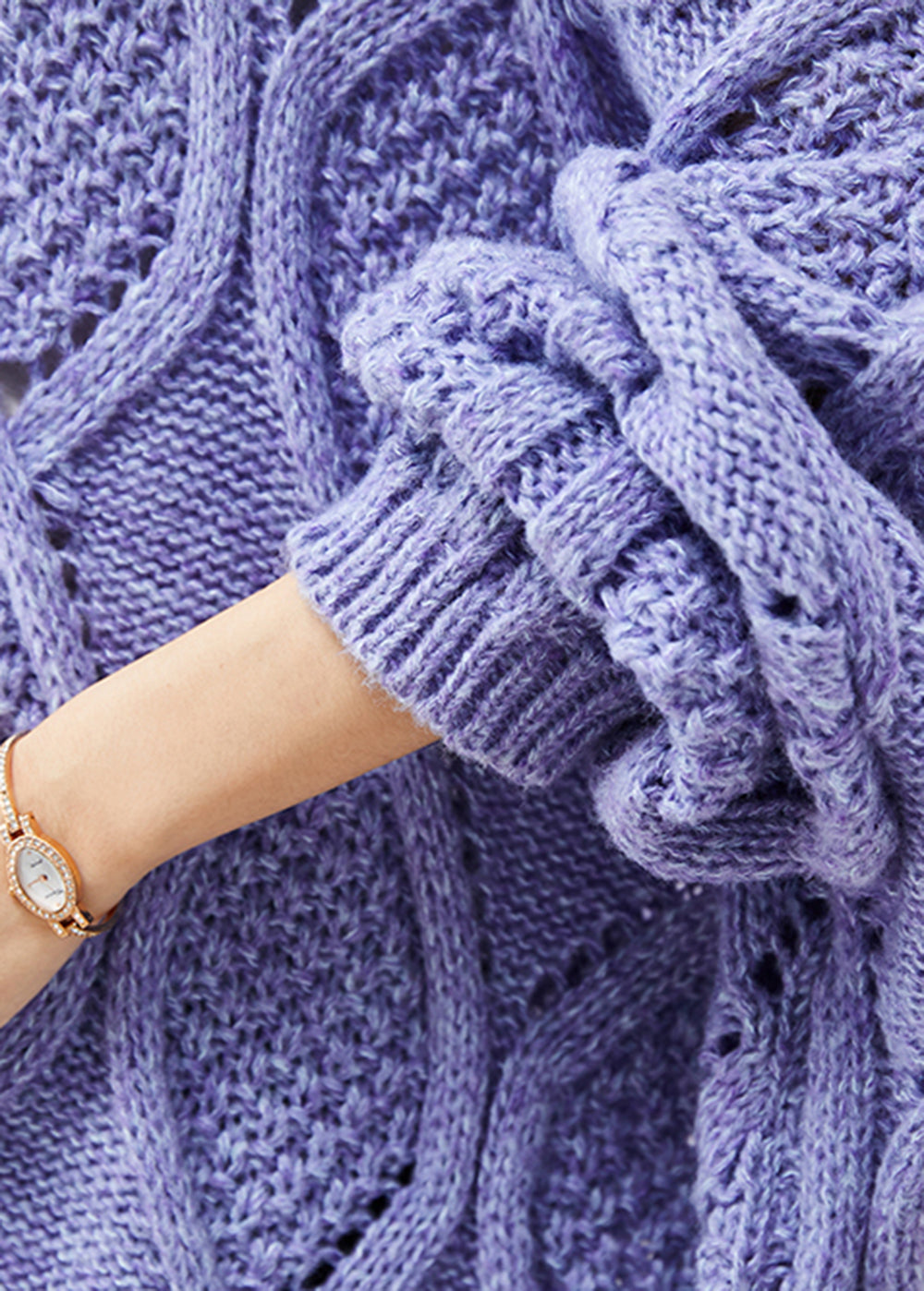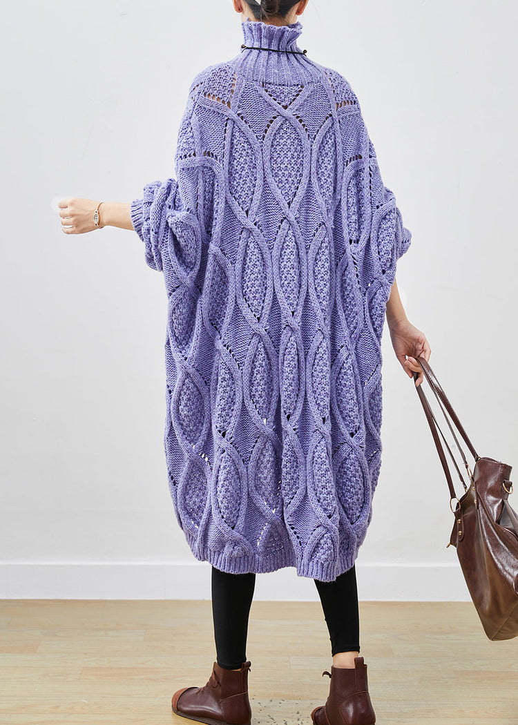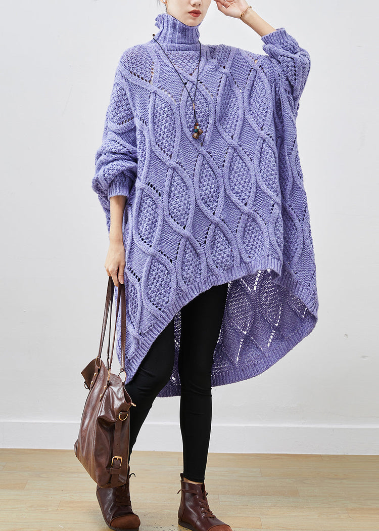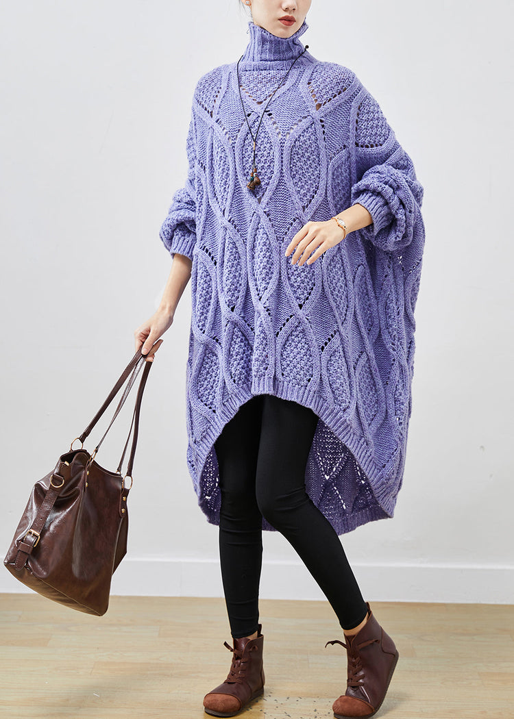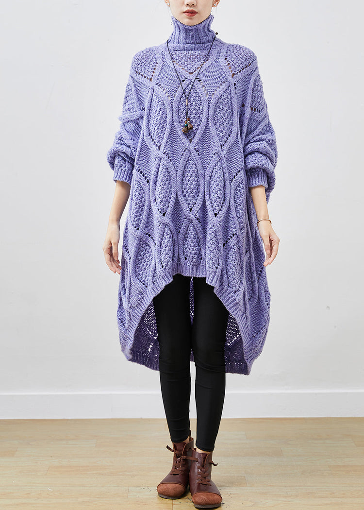 French Purple Turtle Neck Low High Design Cable Long Knit Dress Winter